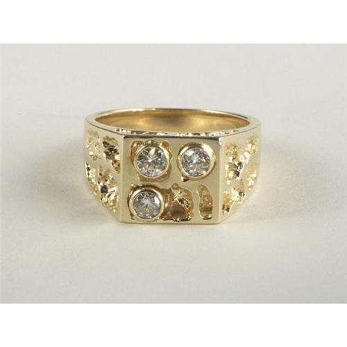 MAN'S RING: Rugged 14k yellow gold man's ring set with three bezel set diamonds. The diamonds measure approximately 0.75 ctw, have SI2 clarity and H color. Appraisal included.