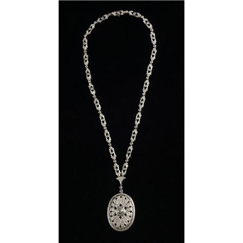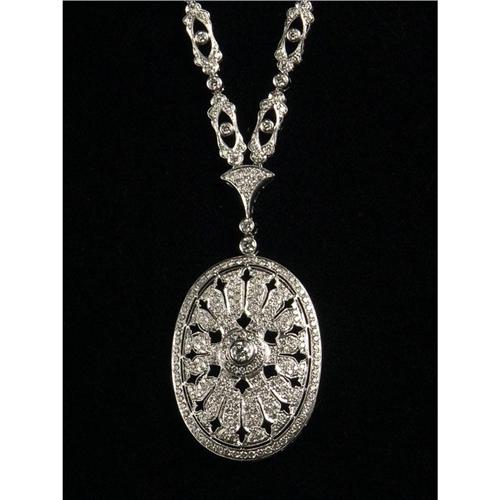 NECKLACE: Shimmering 18K white gold and diamond necklace with a fixed oval pendant. The 426 diamond measure approximately 8.15ctw. Appraisal included.
