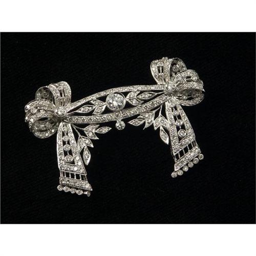 BROOCH: Simply elegant Victorian style filigree 18K white gold and diamond ribbon form brooch. The diamonds measure approximately 2.34ctw. Appraisal included.