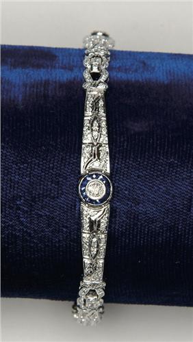DIAMOND AND SAPPHIRE BRACELET. Elegant 14kt white gold bracelet is set with single cut diamonds covering the entire surface. Total diamond weight is approx. .96ct. Three circles, one in the center of each section are set with square cut blue sapphires. Total weight of sapphires approx. .96ct. Bracelet has hidden catch with double safety. SIZE: 7 in. l. CONDITION: Very good to excellent. 5-61590