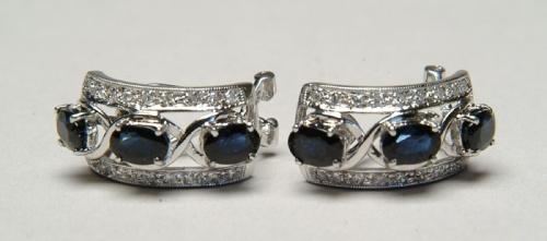 DIAMOND AND SAPPHIRE EARRINGS. Beautiful quarter round white gold earrings are each set with three oval blue sapphires with a band of diamonds down each side. Total weight of diamonds is .65ct while total weight of sapphires is 3.84ct. Nice white gold setting is finished with Omega backs. CONDITION: Very good to excellent. 5-61602