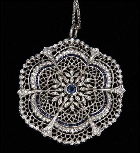 DIAMOND AND SAPPHIRE PENDANT/BROOCH. Very pretty 18kt white gold pendant/brooch has beautiful openwork design with a center round blue sapphire. The pendant/brooch is encrusted with approx. 156 diamonds with a total weight of approx. .75ct and 78 square cut blue sapphires and 1 round blue sapphire with a total sapphire weight of approx. .75ct. Can be worn as a pendant or a brooch. Accompanied by a professional jewelry appraisal. SIZE: Brooch is 1-1/2” dia and comes with a 16” white gold chain. CONDITION: Very good to excellent. 5-62101