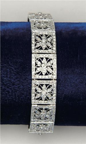 DIAMOND BRACELET. Beautiful Victorian style diamond bracelet has thirteen square links framed in diamonds with a diamond openwork flower in the center of each link. Total diamond weight is approx. 3.5ct. Bracelet is 18kt white gold. Has hidden catch with double safety. SIZE: 7 in. l. CONDITION: Very good to excellent. 5-61589