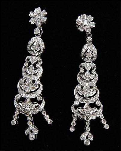 DIAMOND DROP EARRINGS. Beautiful 18kt white gold earrings have floral design at the post with long filigreed drop all, of which are totally encrusted in single cut diamonds. SIZE: 1-3/4" l. CONDITION: Very good to excellent. 5-61904