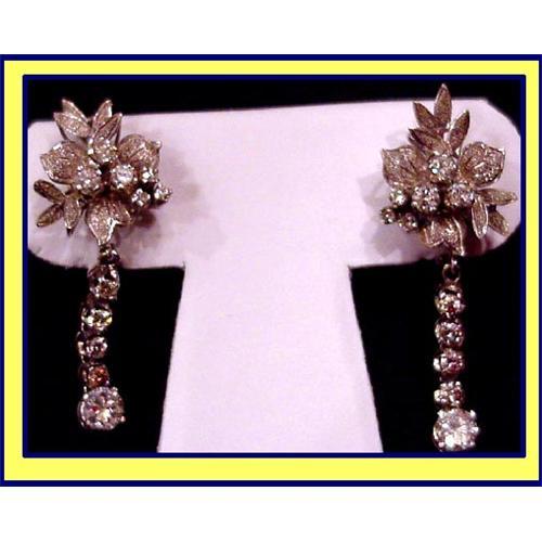 Pair of early 20th century diamond drop earrings. <BR>Each measures 1 5/8inches long. They are nearly 1.5 carats together.<BR>Flower form clusters with dangles that swing as the wearer moves. Quality workmanship.<BR>Mint condition.