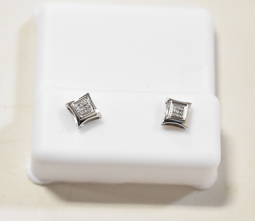 SHAPED SET WITH 18 ROUND BRILLIANT DIAMONDS- SET IN SILVER. LOCKING SCREW BACK.