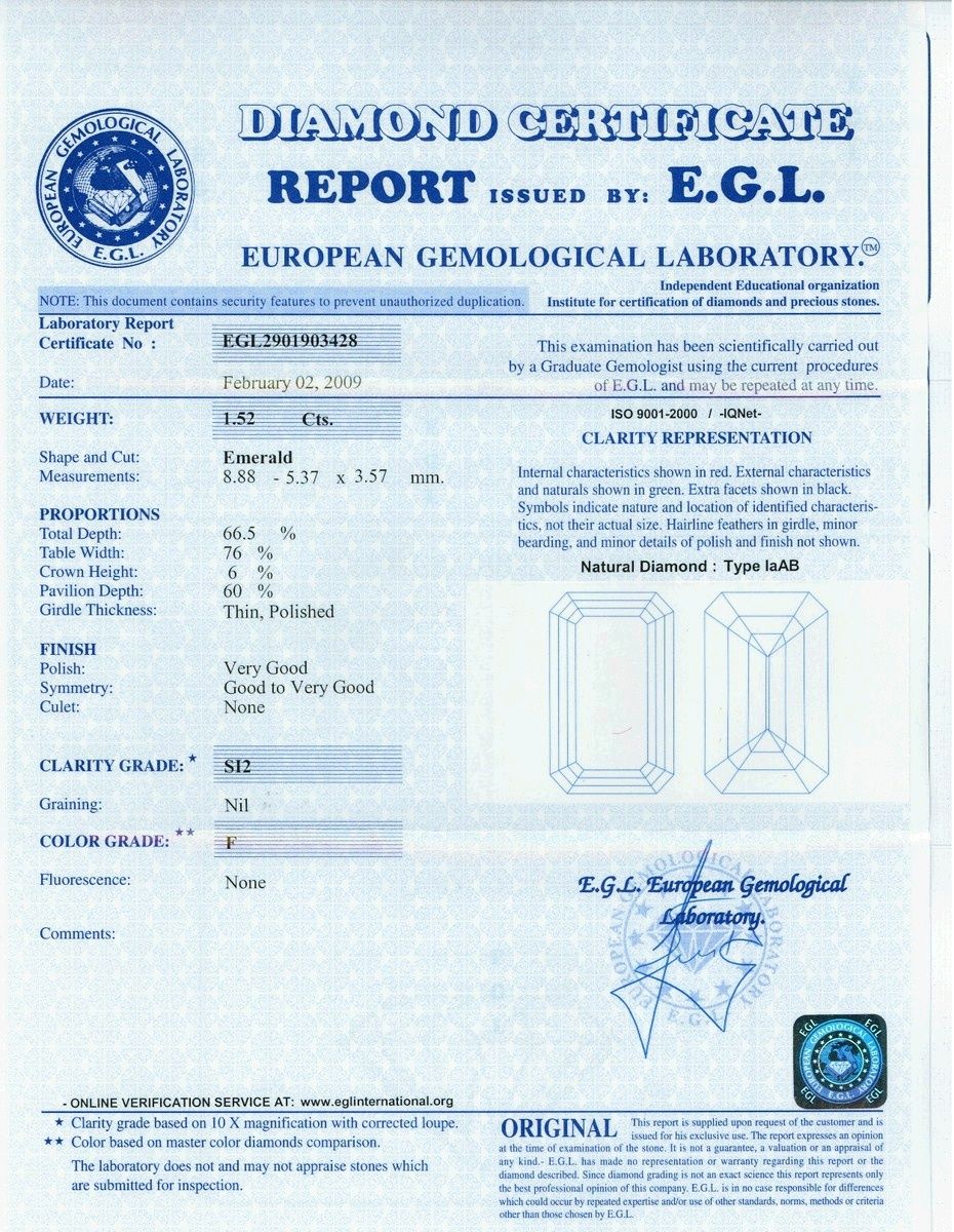 DIAMOND EGL CERTIFIED Emerald 1.52 CTW F, SI2 **|**|** 8.88x5.37x3.57mm;Cut Very Good; Polish Very Good; Symmetry Good to Very Good; Fluo None; Depth 66.5%; Table 76% ; MSRP: $13928