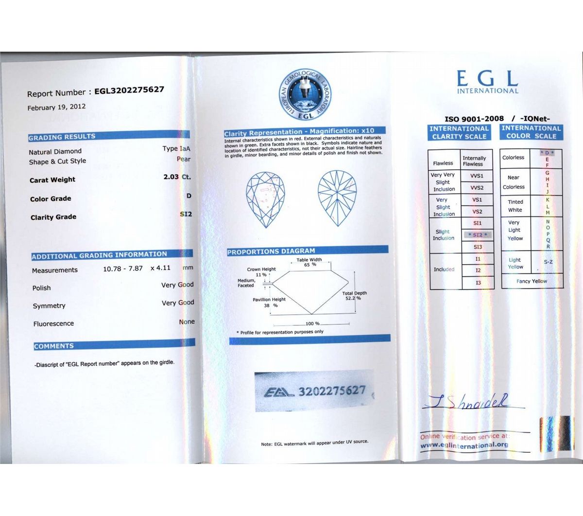 DIAMOND EGL CERTIFIED PEAR 2.03 CTW D, SI2 **|**|** 10.78x7.87x4.11mm;Cut Very Good; Polish Very Good; Symmetry Good; Fluo None; Depth 52.2%; Table 65% ; MSRP: $25700