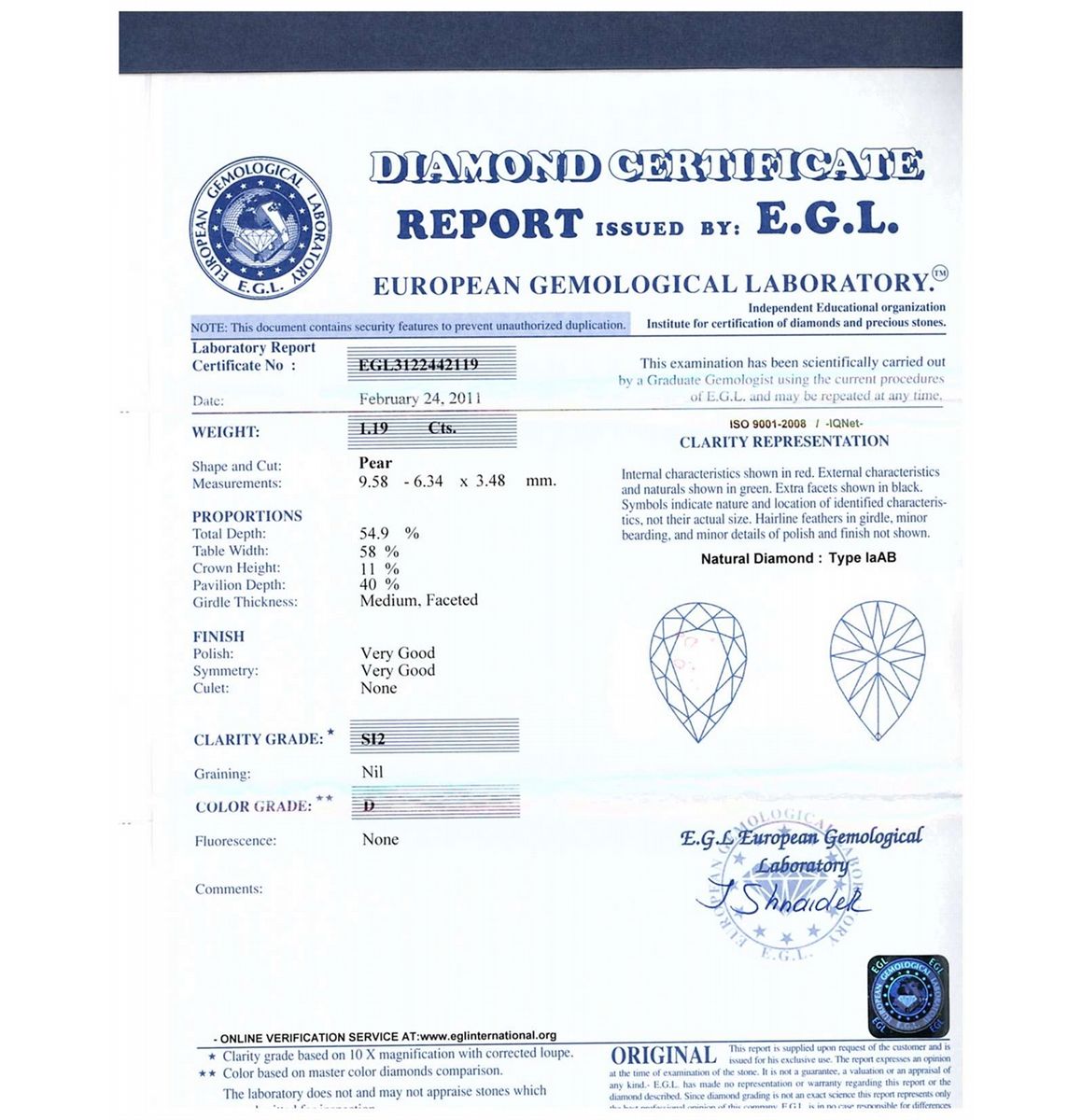 DIAMOND EGL CERTIFIED Pear 1.19 CTW D, SI2 **|**|** 9.58x6.34x3.48mm;Cut Very Good; Polish Very Good; Symmetry Very Good; Fluo None; Depth 54.9%; Table 58% ; MSRP: $8544