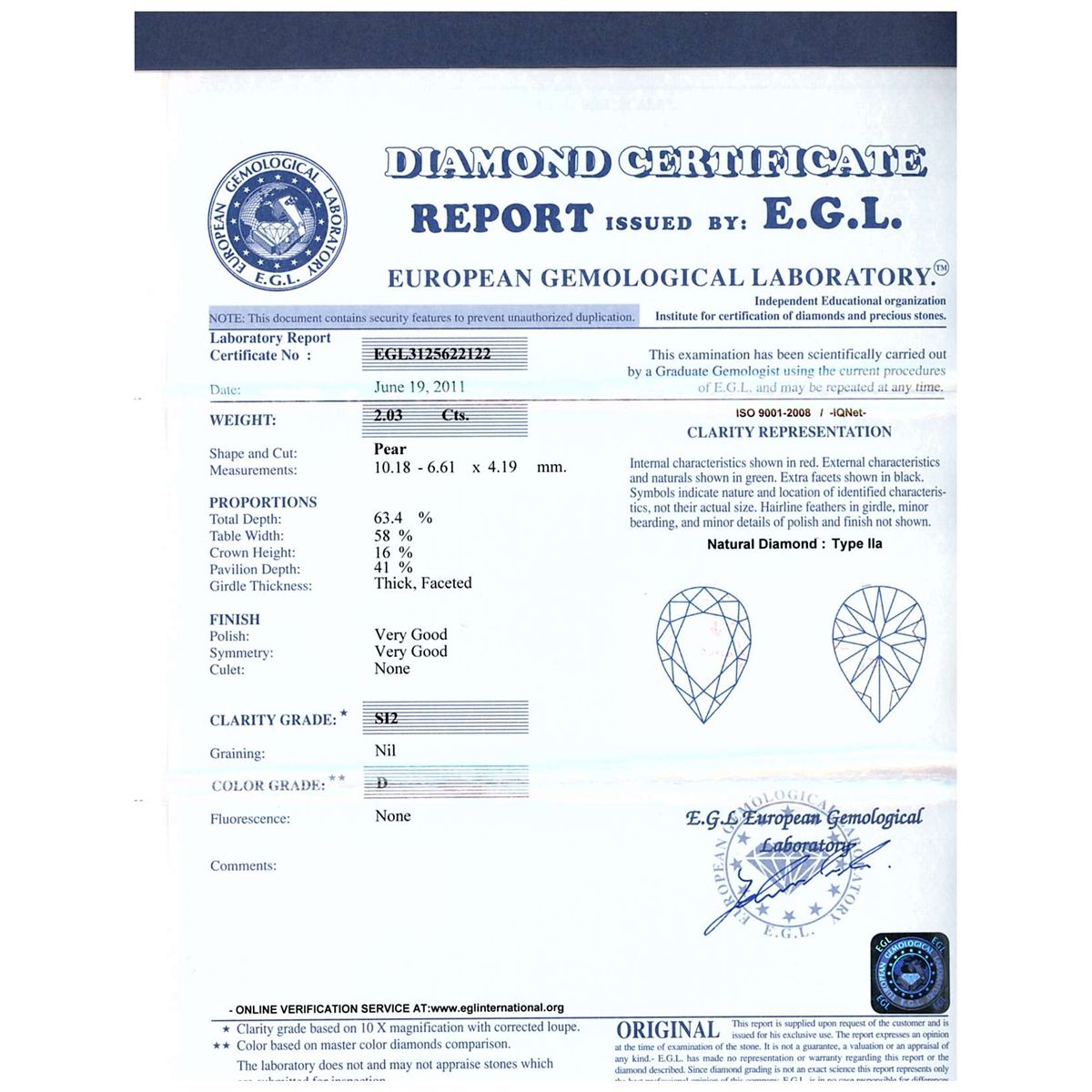 DIAMOND EGL CERTIFIED Pear 2.03 CTW D, SI2 **|**|** 10.18x6.61x4.19mm;Cut Very Good; Polish Very Good; Symmetry Very Good; Fluo None; Depth 63.4%; Table 58% ; MSRP: $24304