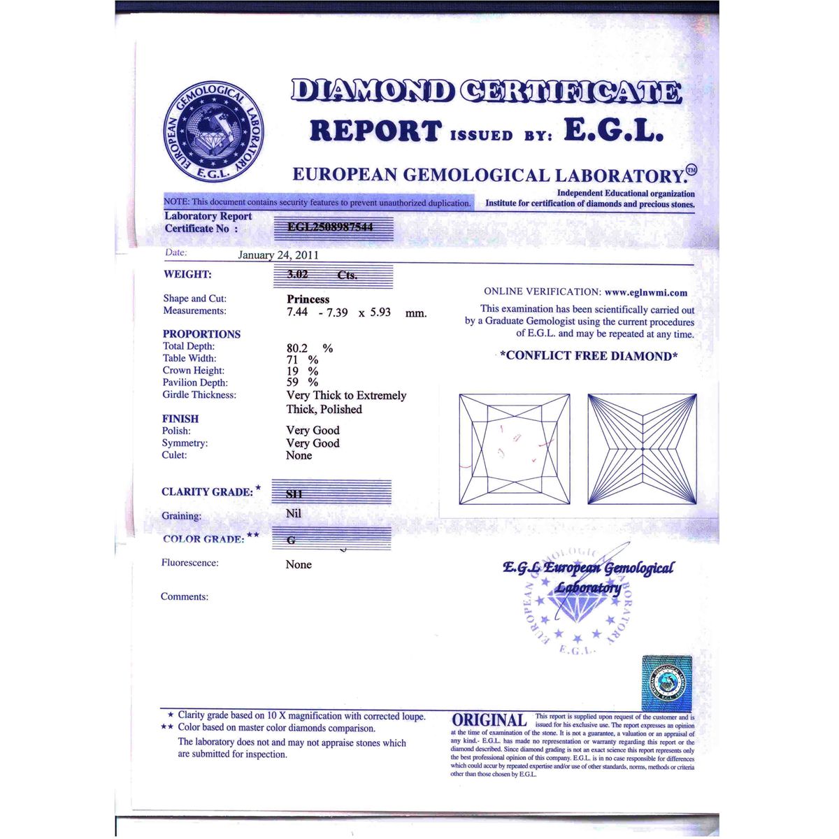 DIAMOND EGL CERTIFIED Princess 3.02 CTW G, SI1 **|**|** 7.44x7.39x5.93mm;Cut Very Good; Polish Good to Very Good; Symmetry Very Good; Fluo None; Depth 80.2%; Table 71% ; MSRP: $281168