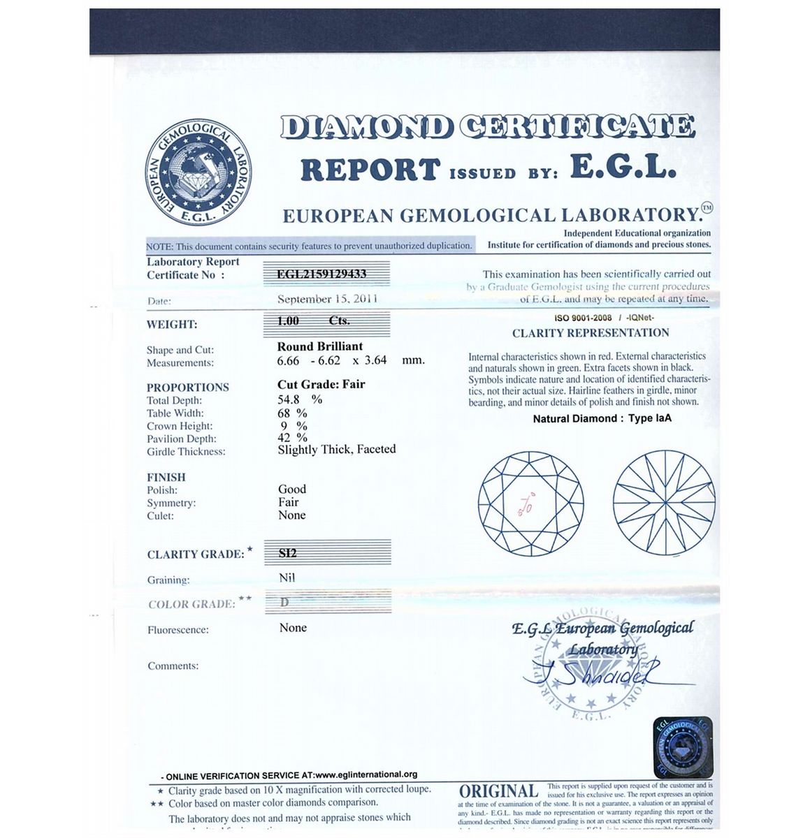 DIAMOND EGL CERTIFIED ROUND 1.00 CTW D, SI2 **|**|** 6.66x6.62x3.64mm;Cut Good; Polish Good; Symmetry Fair; Fluo None; Depth 54.8%; Table 68% ; MSRP: $10600