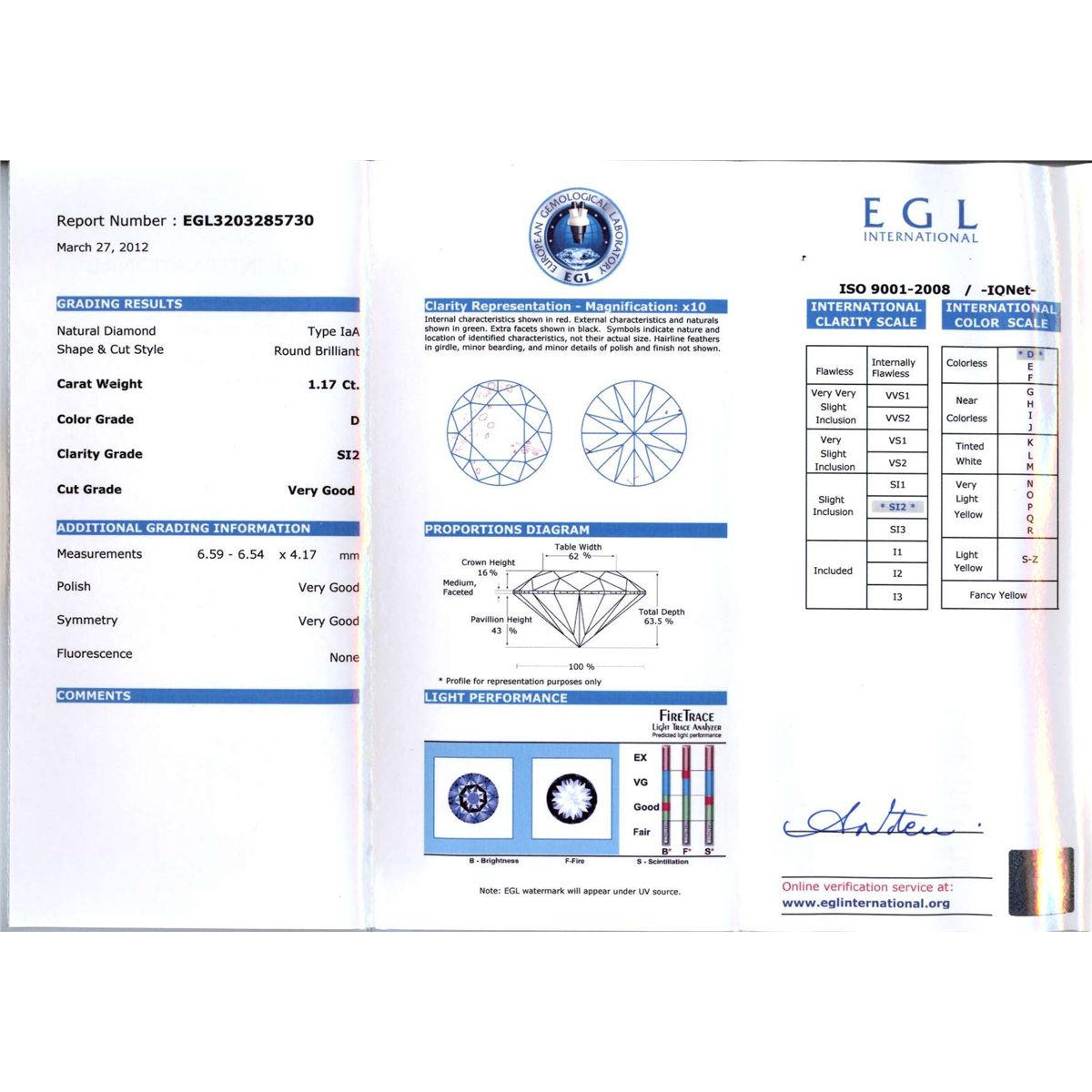 DIAMOND EGL CERTIFIED ROUND 1.17 CTW D, SI2 **|**|** 6.59x6.54x4.17mm;Cut Very Good; Polish Very Good; Symmetry Very Good; Fluo None; Depth 63.5%; Table 62% ; MSRP: $12404
