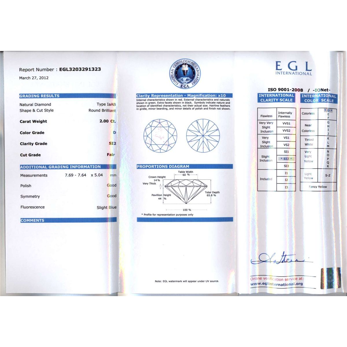 DIAMOND EGL CERTIFIED ROUND 2.00 CTW D, SI2 **|**|** 7.69x7.64x5.04mm;Cut Fair; Polish Good; Symmetry Good; Fluo Slight Blue; Depth 65.8%; Table 60% ; MSRP: $33256