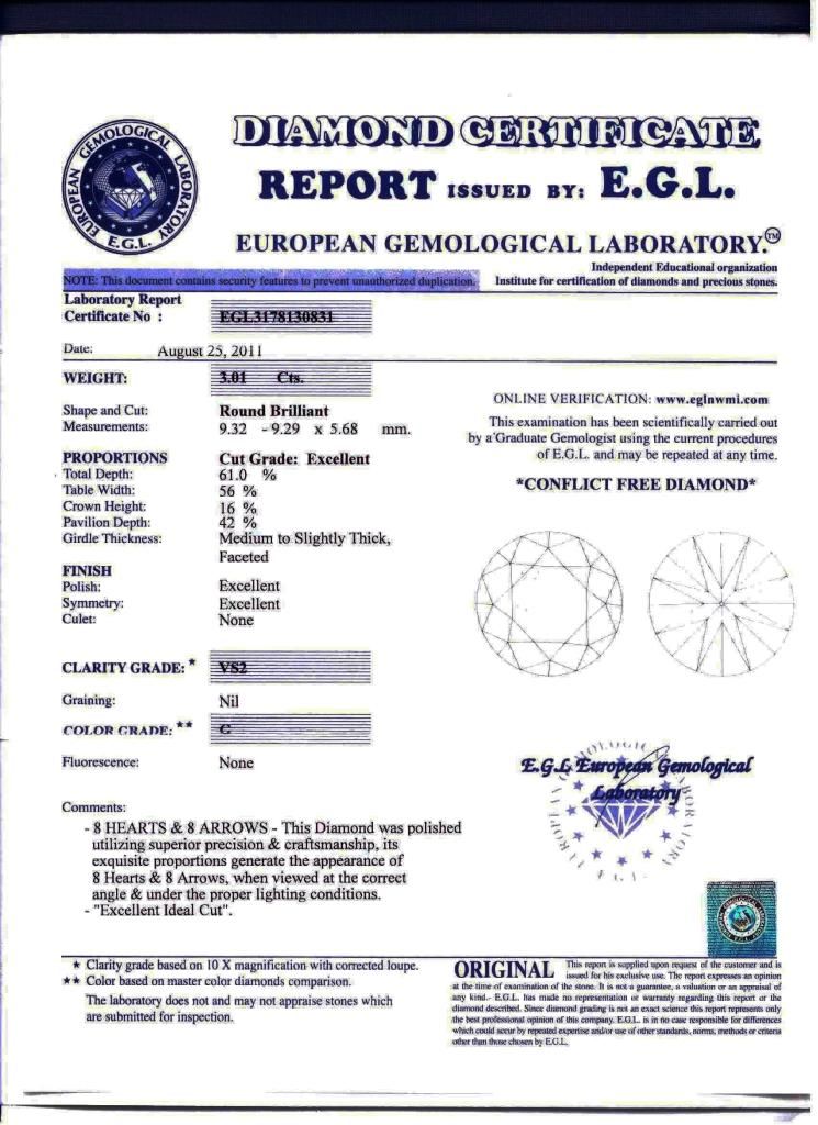 DIAMOND EGL CERTIFIED ROUND 3.01 CTW G, VS2 **|**|** 9.32x9.29x5.68mm;Cut EXCELLENT; Polish EXCELLENT; Symmetry EXCELLENT; Fluo None; Depth 61%; Table 56% ; MSRP: $428000