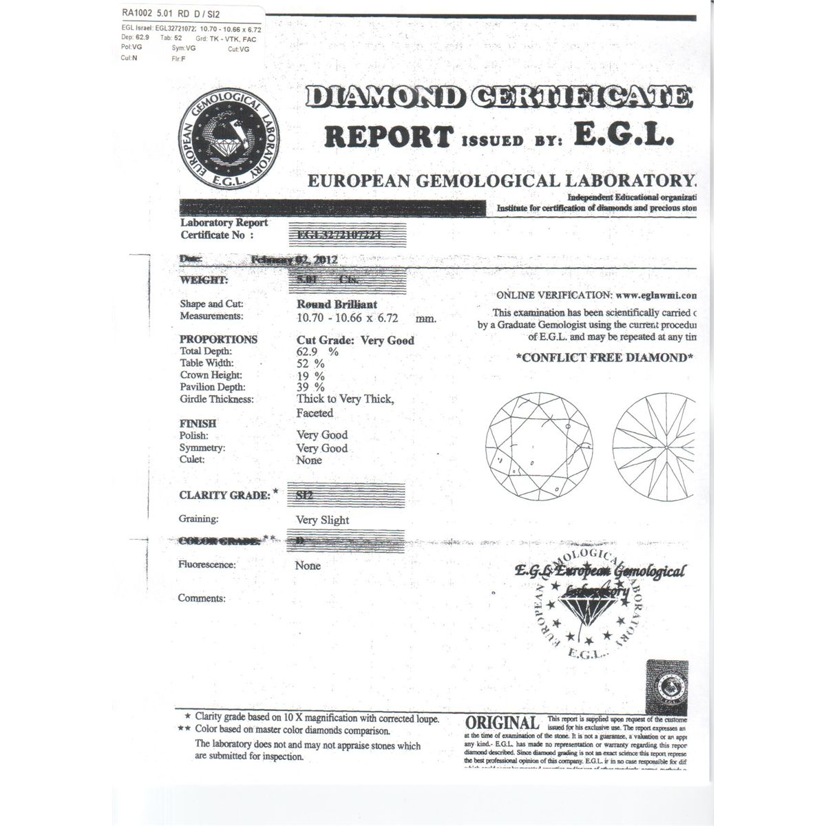 DIAMOND EGL CERTIFIED ROUND 5.04 CTW D, SI2 **|**|** 10.70x10.66x6.72mm;Cut Very Good; Polish Good to Very Good; Symmetry Very Good; Fluo None; Depth 62.9%; Table 52% ; MSRP: $641200