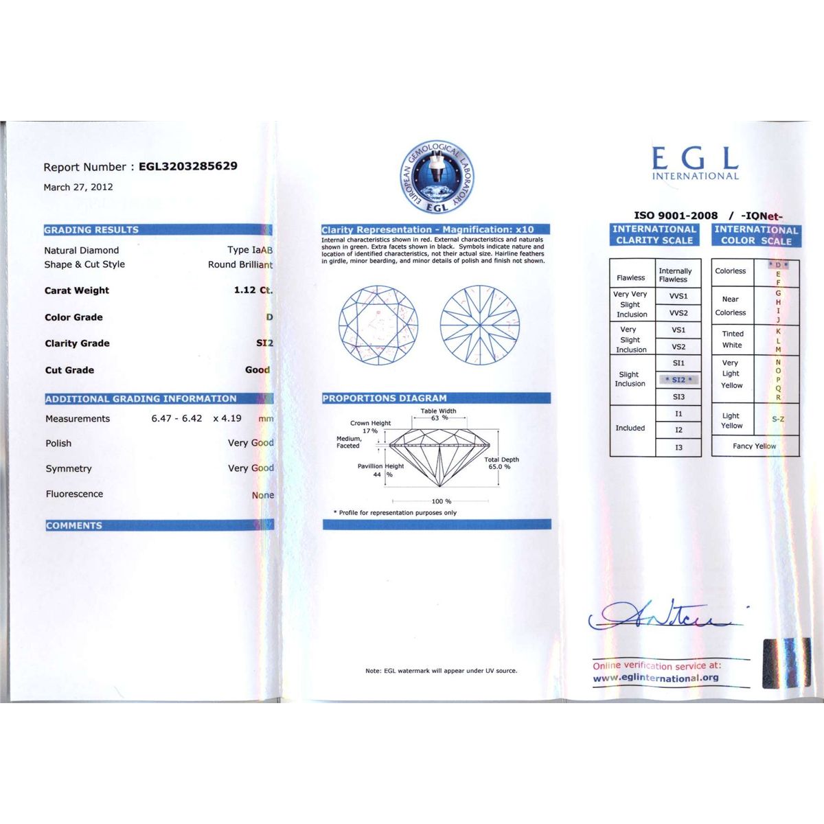 DIAMOND EGL CERTIFIED Round 1.12 CTW D, SI2 **|**|** 6.47x6.42x4.19mm;Cut Very Good; Polish Very Good; Symmetry Very Good; Fluo None; Depth 65%; Table 63% ; MSRP: $11548