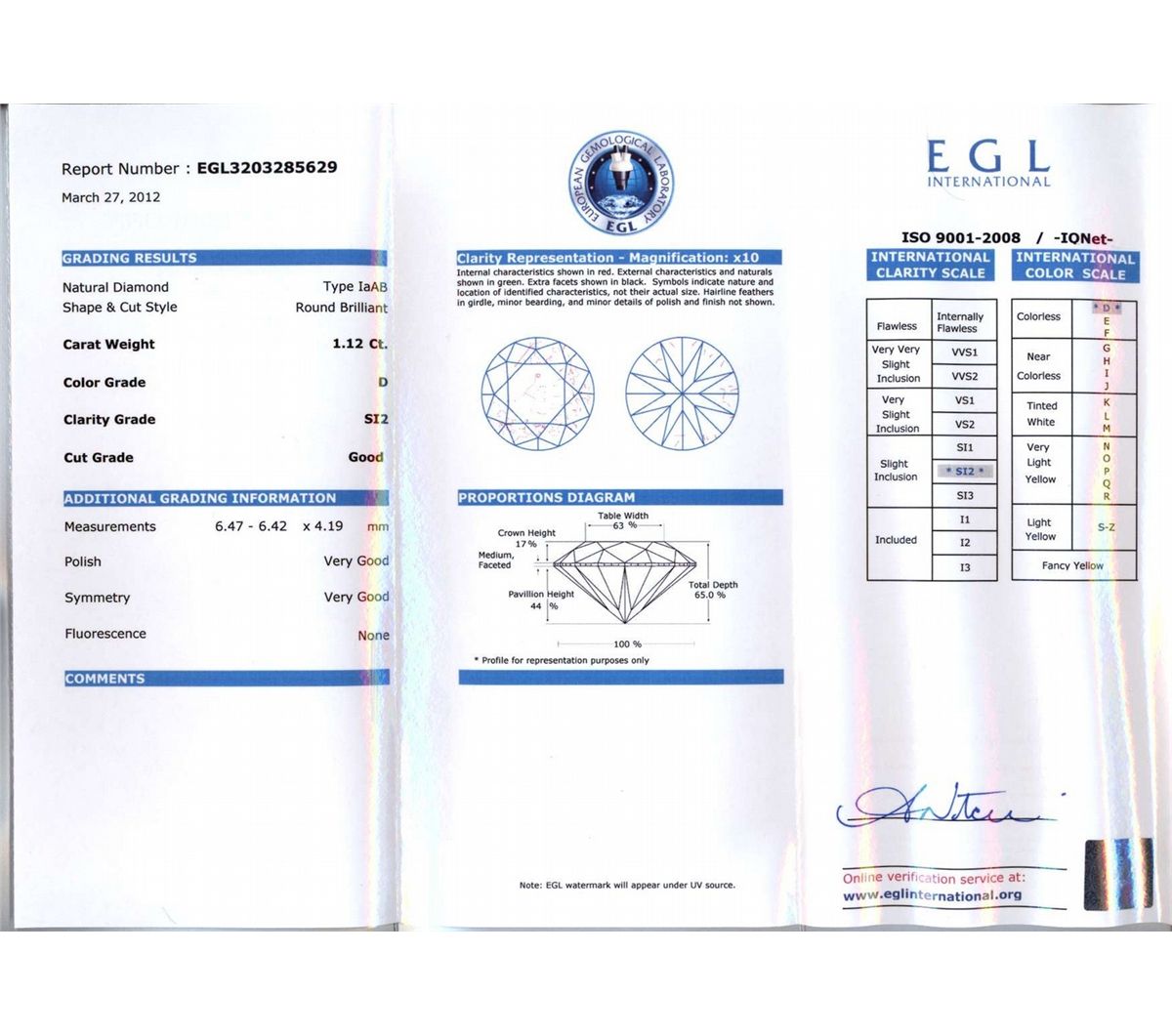 DIAMOND EGL CERTIFIED Round 1.12 CTW D, SI2 **|**|** 6.47x6.42x4.19mm;Cut Very Good; Polish Very Good; Symmetry Very Good; Fluo None; Depth 65%; Table 63% ; MSRP: $11548