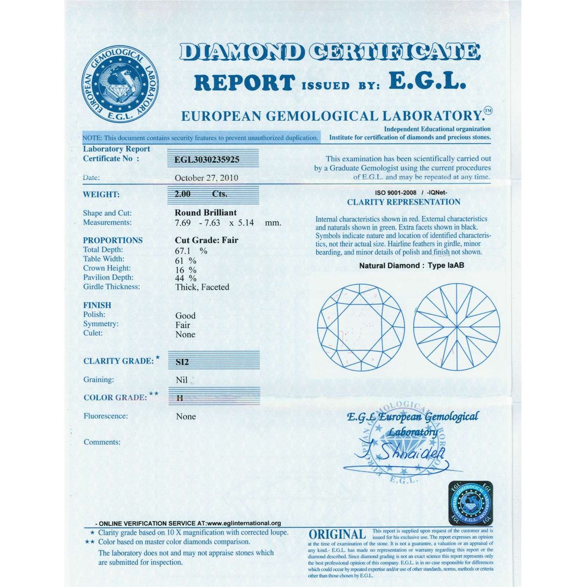 DIAMOND EGL CERTIFIED Round 2.00 CTW H, SI2 **|**|** 7.69x7.63x5.14mm;Cut Good; Polish Good; Symmetry Fair; Fluo None; Depth 67.1%; Table 61% ; MSRP: $28672