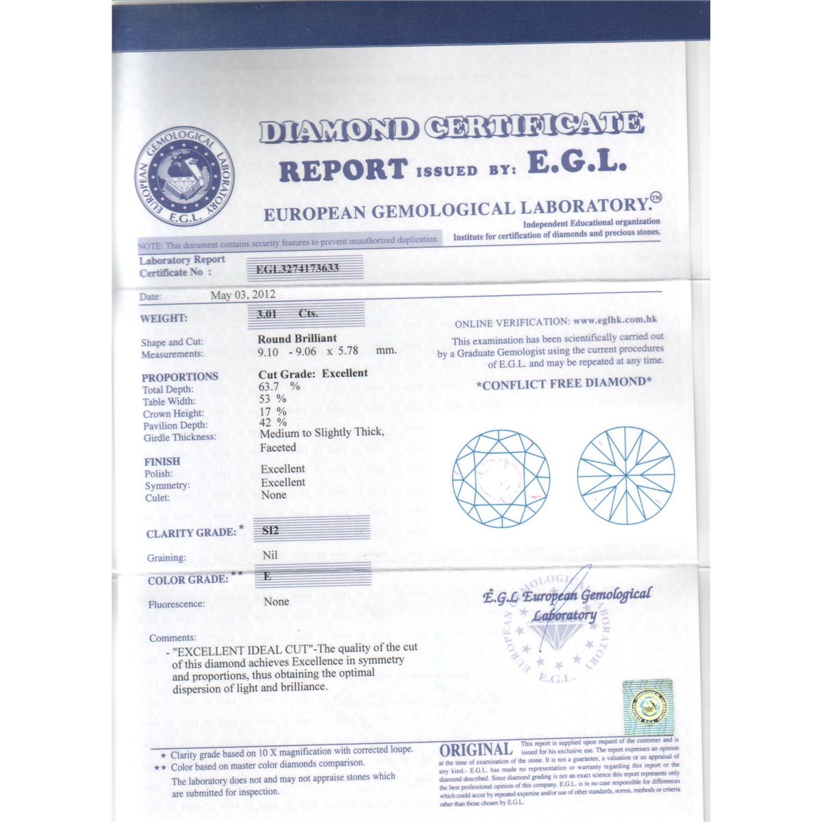 DIAMOND EGL CERTIFIED Round 3.01 CTW E, SI2 **|**|** 9.10x9.06x5.78mm;Cut EXCELLENT; Polish EXCELLENT; Symmetry EXCELLENT; Fluo None; Depth 63.7%; Table 53% ; MSRP: $312080