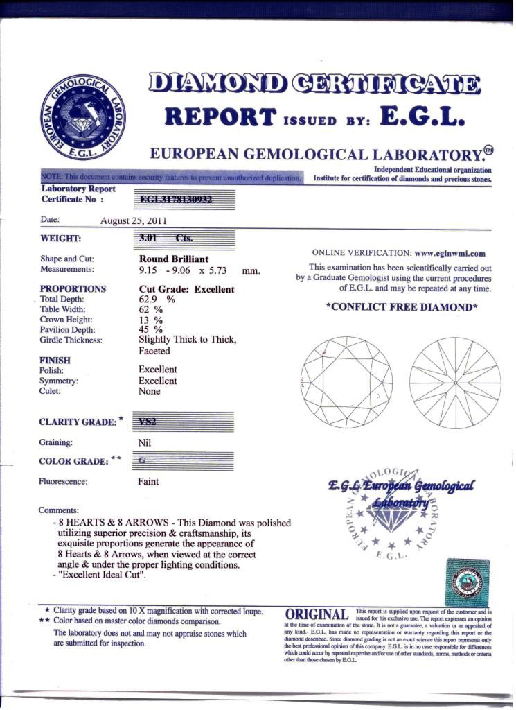 DIAMOND EGL CERTIFIED Round 3.01 CTW G, VS2 **|**|** 9.15x9.06x5.73mm;Cut EXCELLENT; Polish EXCELLENT; Symmetry EXCELLENT; Fluo None; Depth 62.9%; Table 62% ; MSRP: $479968