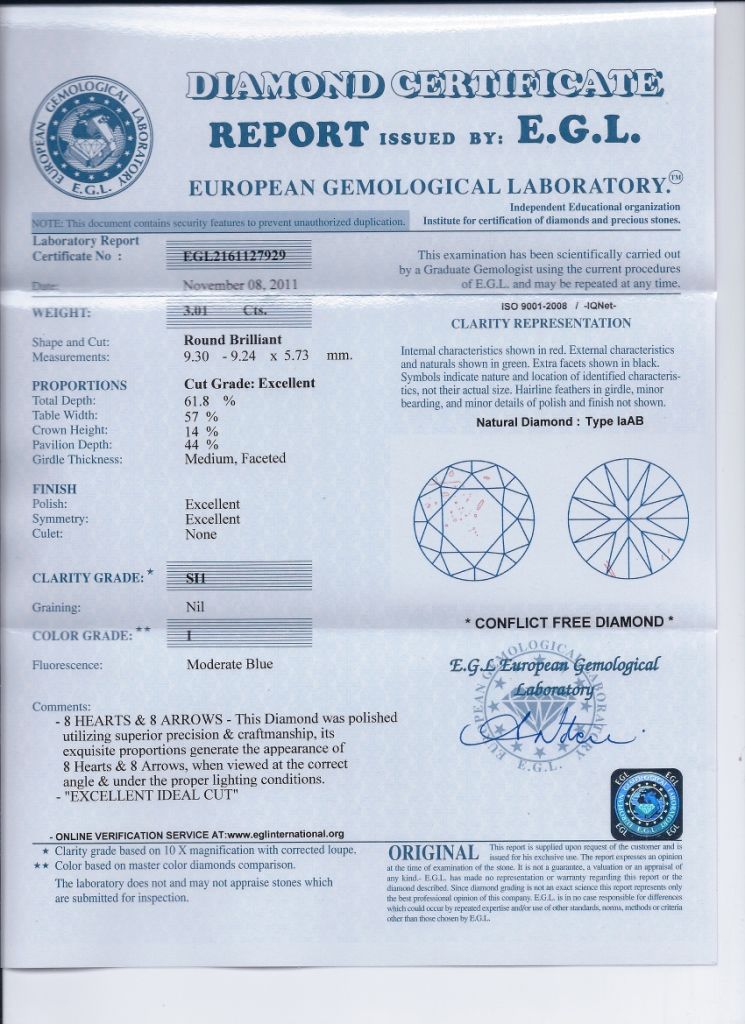 DIAMOND EGL CERTIFIED Round 3.01 CTW I, SI1 **|**|** 9.30x9.24x5.73mm;Cut EXCELLENT; Polish EXCELLENT; Symmetry EXCELLENT; Fluo None; Depth 61.8%; Table 57% ; MSRP: $300368