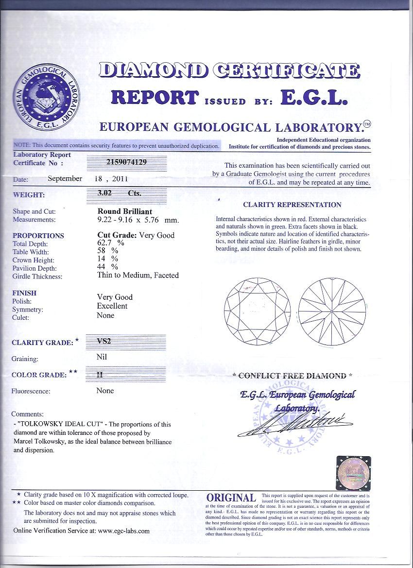 DIAMOND EGL CERTIFIED Round 3.02 CTW H, VS2 **|**|** 9.22x9.16x5.76mm;Cut Very Good; Polish Good to Very Good; Symmetry Excellent; Fluo None; Depth 62.7%; Table 58% ; MSRP: $465184
