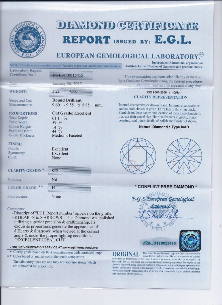 DIAMOND EGL CERTIFIED Round 3.21 CTW H, SI2 **|**|** 9.60x9.55x5.85mm;Cut EXCELLENT; Polish EXCELLENT; Symmetry EXCELLENT; Fluo None; Depth 61.1%; Table 59% ; MSRP: $311968