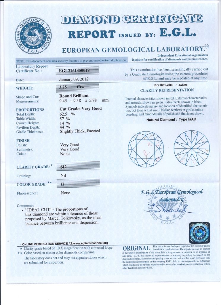 DIAMOND EGL CERTIFIED Round 3.25 CTW H, SI2 **|**|** 9.45x9.38x5.88mm;Cut Very Good; Polish Good to Very Good; Symmetry Very Good; Fluo None; Depth 62.5%; Table 57% ; MSRP: $323904