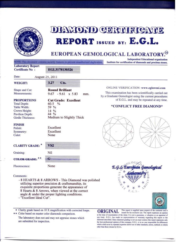DIAMOND EGL CERTIFIED Round 3.27 CTW G, VS2 **|**|** 9.67x9.61x5.83mm;Cut EXCELLENT; Polish EXCELLENT; Symmetry EXCELLENT; Fluo None; Depth 60.5%; Table 59% ; MSRP: $611152