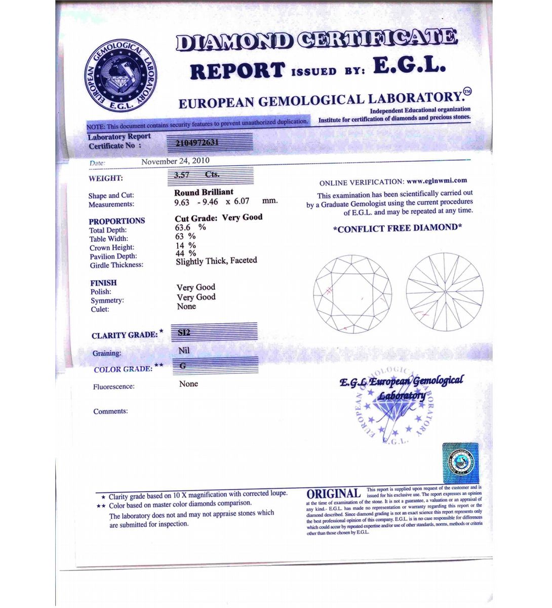 DIAMOND EGL CERTIFIED Round 3.57 CTW G, SI2 **|**|** 9.63x9.46x6.07mm;Cut Very Good; Polish Good to Very Good; Symmetry Very Good; Fluo None; Depth 63.6%; Table 63% ; MSRP: $338544