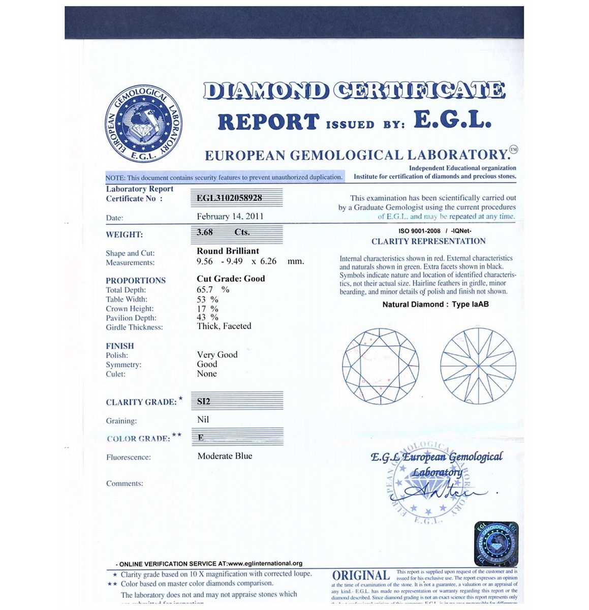 DIAMOND EGL CERTIFIED Round 3.68 CTW E, SI2 **|**|** 9.56x9.49x6.26mm;Cut Very Good; Polish Very Good; Symmetry Good; Fluo Moderate Blue; Depth 65.7%; Table 53% ; MSRP: $79400