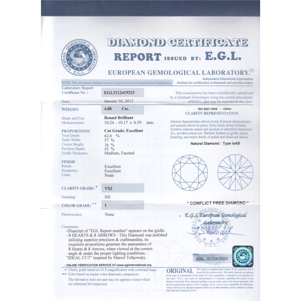 DIAMOND EGL CERTIFIED Round 4.08 CTW I, VS2 **|**|** 10.24x10.17x6.39mm;Cut EXCELLENT; Polish EXCELLENT; Symmetry EXCELLENT; Fluo None; Depth 62.6%; Table 57% ; MSRP: $476544