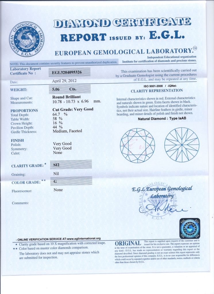 DIAMOND EGL CERTIFIED Round 5.06 CTW G, SI2 **|**|** 10.78x10.73x6.96mm;Cut Very Good; Polish Good to Very Good; Symmetry Very Good; Fluo None; Depth 64.7%; Table 58% ; MSRP: $627120