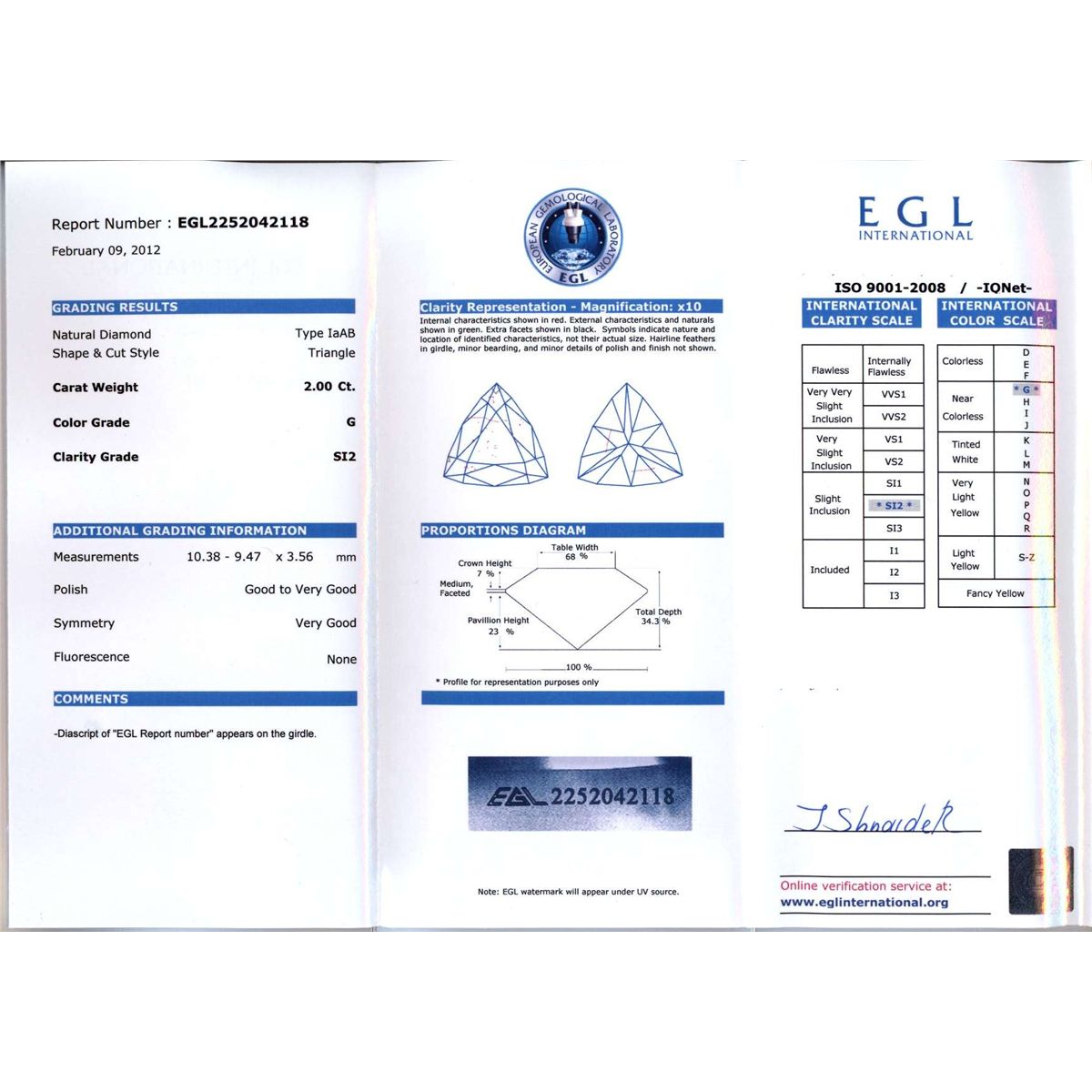 DIAMOND EGL CERTIFIED Triangle 2.00 CTW G, SI2 **|**|** 10.38x9.47x3.56mm;Cut Very Good; Polish Very Good; Symmetry Very Good; Fluo None; Depth 34.3%; Table 68% ; MSRP: $21992