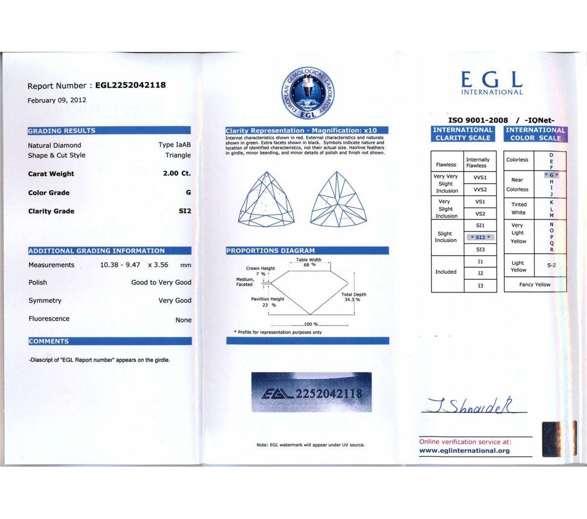 DIAMOND EGL CERTIFIED Triangle 2.00 CTW G, SI2 **|**|** 10.38x9.47x3.56mm;Cut Very Good; Polish Very Good; Symmetry Very Good; Fluo None; Depth 34.3%; Table 68% ; MSRP: $21992