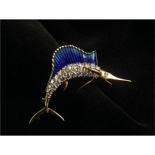 DIAMOND, EMERALD, ENAMEL SWORDFISH BROOCH