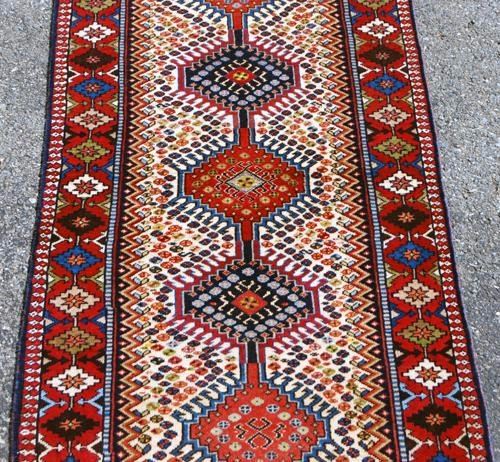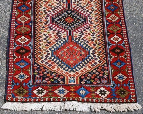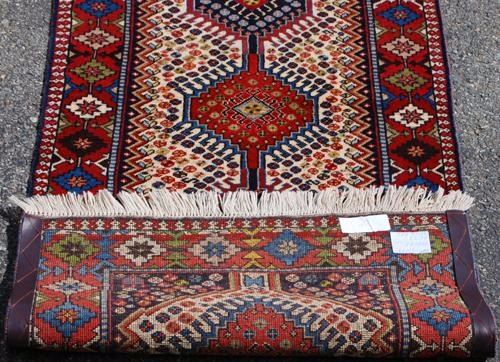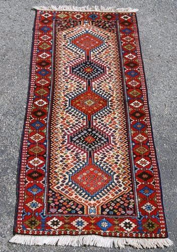 THIS YALAMEH RUNNERS HAS A UNIQUE TRIBAL PATTERN AND A VERY WARM LOOK. SIZE 6.3 X 2.5 FEET. A UNIQUE CHARACTERISTIC OF DIAMOND-SHAPED MEDALLIONS IN A STRAIGHT LINE MADE THIS RUG TO BE A GREAT CHOICE WITH MODERN FURNITURE. DARK RED AND LIGHT BROWN ON A BLUE /ORANGE BACKGROUND MADE THIS RUNNER A UNIQUE YALAMEH. MADE OF SOFT WOOL; THIN, TIGHT PILE ON WOOL. YALAMEH IS THE NAME GIVEN TO THE FLAMBOYANT SOUTHERN IranIAN CARPETS WOVEN PRIMARILY IN AND AROUND THE VILLAGE OF ALIABAD IN THE SOUTHERN IranIAN PROVINCE OF FARS IN SOUTH OF FARS PROVINCE IN Iran. YALAMEH RUGS AND CARPETS ARE AMONG THE BEST TRIBAL RUGS AND CARPETS WOVEN IN Iran. YALAMEH RUGS, WELL KNOWN FOR TOP QUALITY TRIBAL RUGS WITH BEAUTIFUL DIAMOND PATTERNS, DISTINCTIVE USE OF COLOR, AND IMAGINATIVE DESIGNS. AS A RESULT OF THE HANDMADE WEAVING PROCESS, NOT ALL SIDES MAY BE STRAIGHT OR CORNERS SQUARE.
