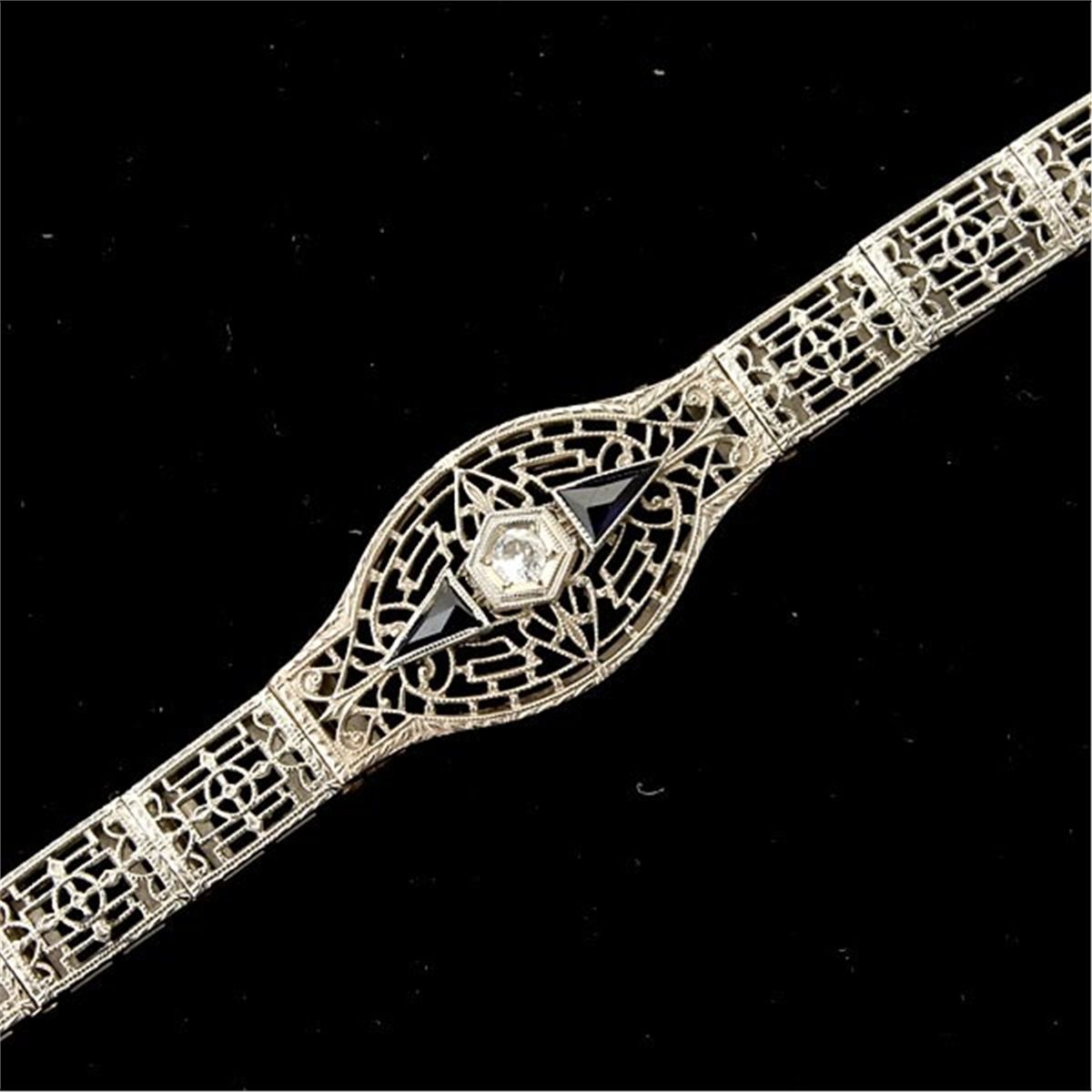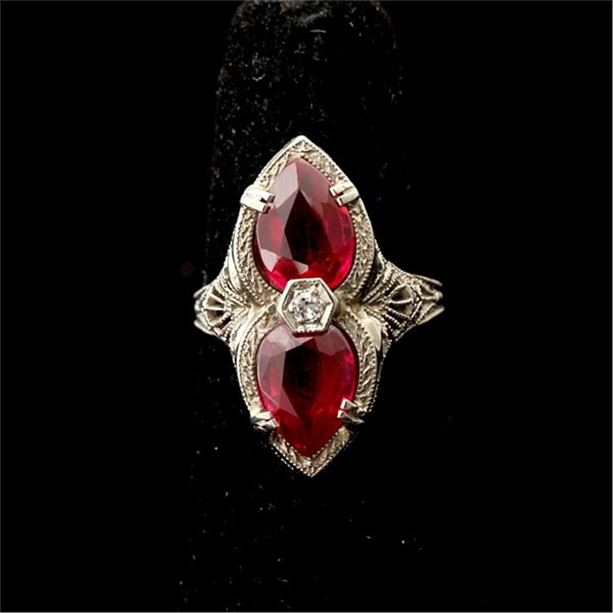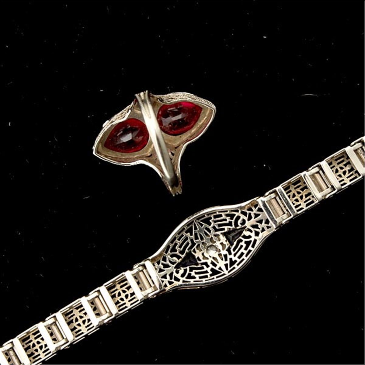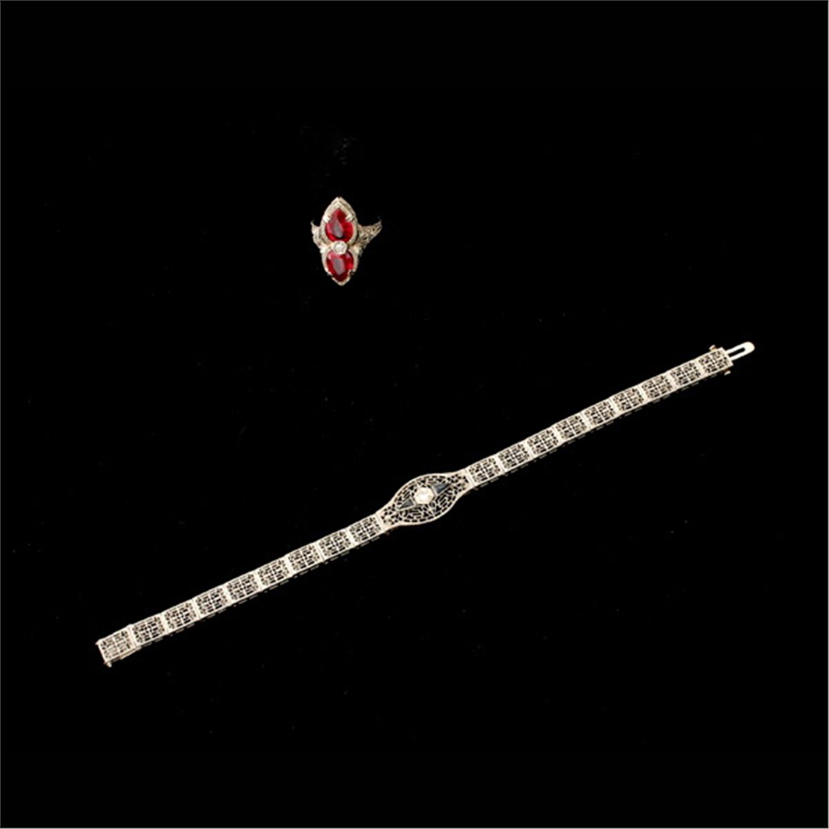 COLLECTION OF DIAMOND, SYNTHETIC SAPPHIRE, 14K WHITE GOLD JEWELRY ITEMS. Including one diamond, synthetic sapphire, 14k white gold filigree bracelet together with a synthetic ruby, 14k white gold filigree ring size 6. 9.50 dwts