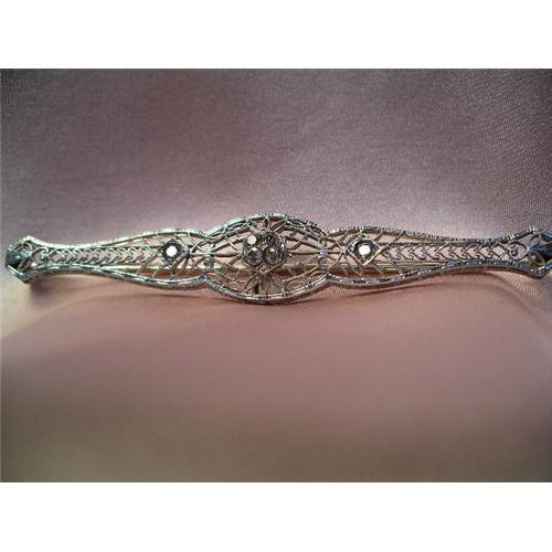 MARVELOUS FINE FILLIGREE WITH DIAMONDS! THREE INCHES LONG BROOCH CAN BE USED AS A PENDANT and contains four brilliant cut diamonds set in a cluster in the center with one brilliant cut diamond set on each side of the center cluster. The total diamond weight is approximately .36 carat. The color is K and the clarity is I2.