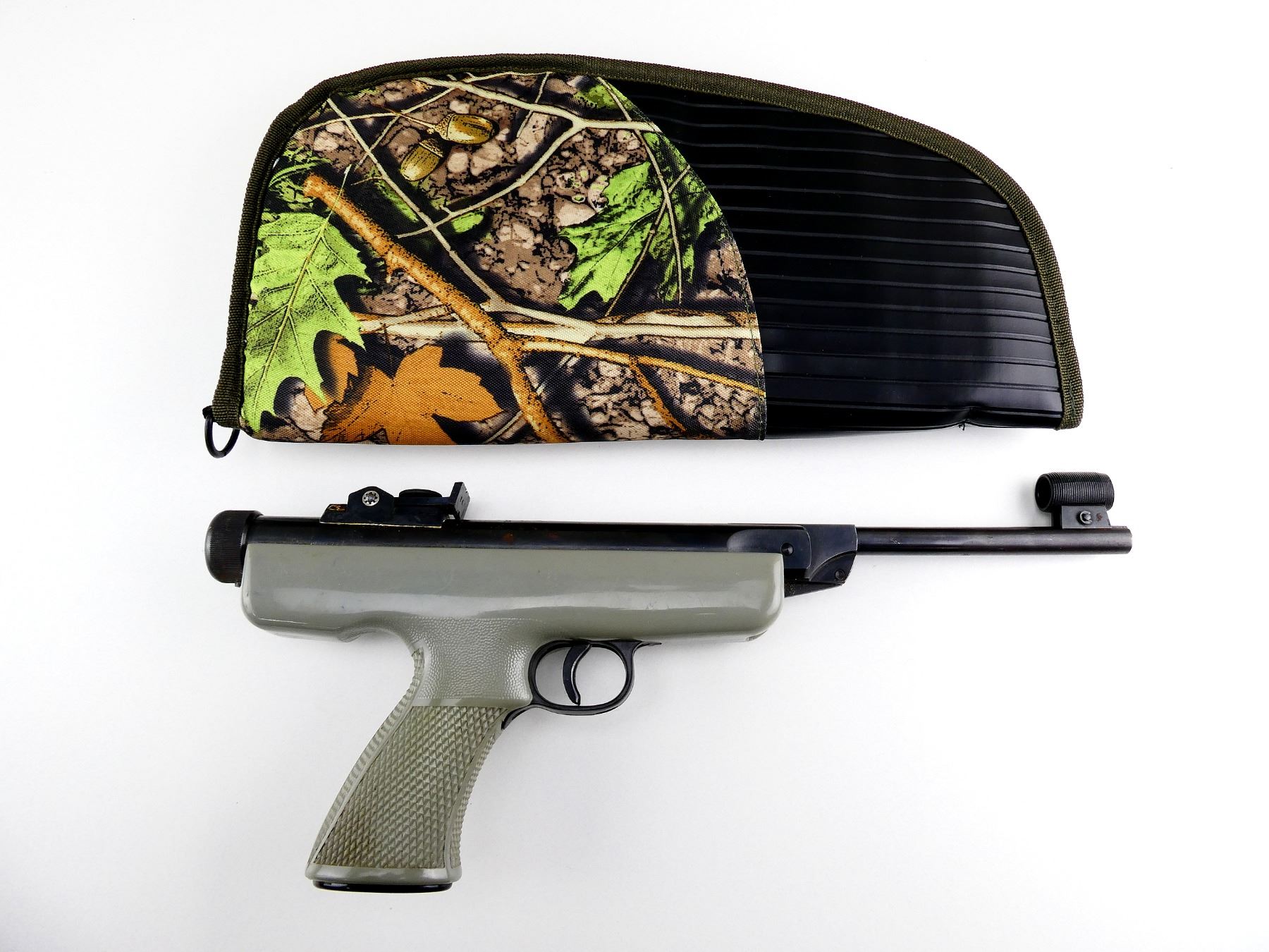 LOT INCLUDES; (1) .177 CAL PELLET, SPRING / AIR POWERED, SINGLE SHOT, BREAK ACTION, BLUED STEEL CONSTRUCTION WITH GREY POLYMER GRIP, MARKED: "DIANA, MOD 5" & "431401611", FRONT SIGHT & ADJUSTABLE REAR SIGHT, NO COCKING ISSUES, NOT FULLY TESTED, (1) CAMOUFLAGE HANDGUN CASE, ZIPPERED (WORKS) . SEE PHOTOS.