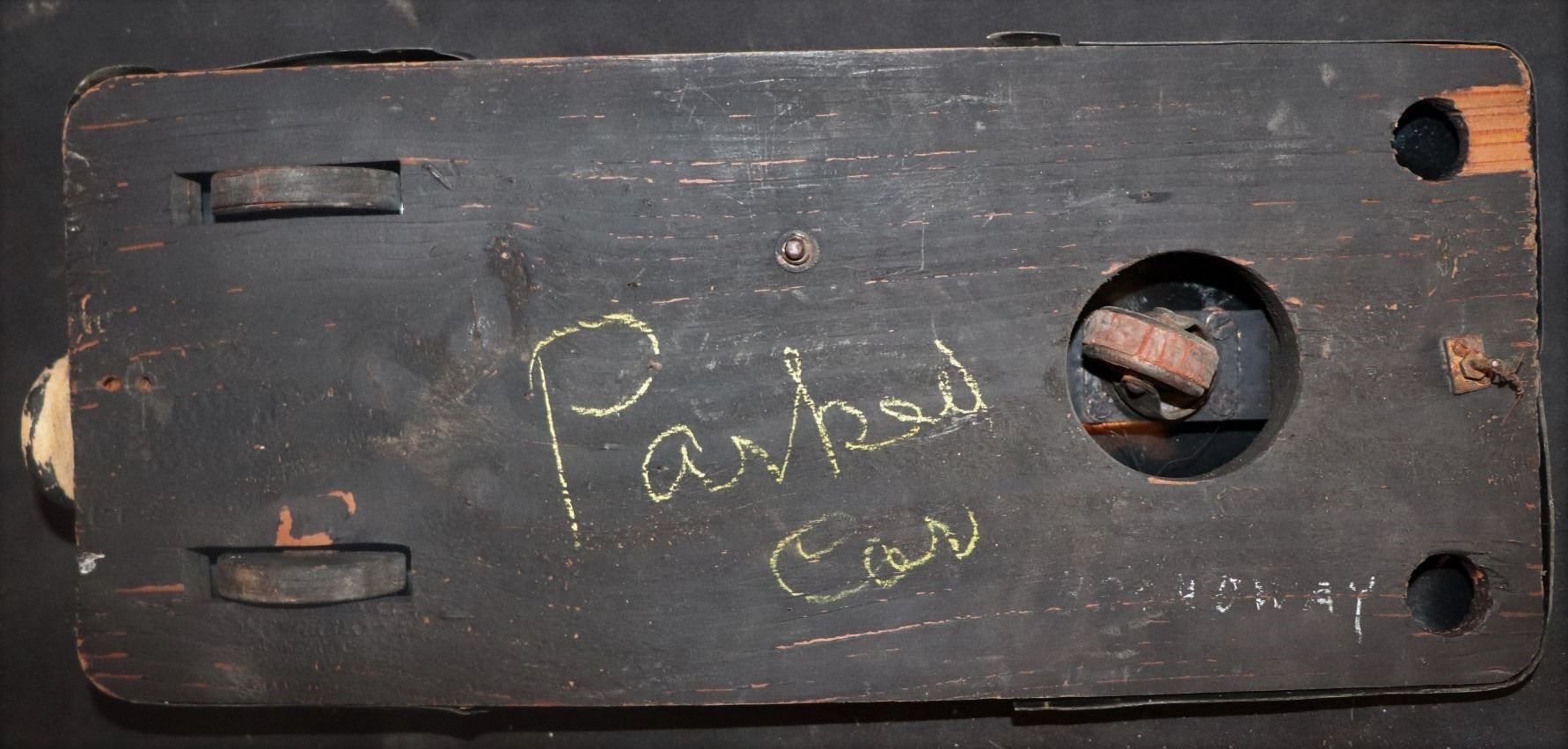 This is an early vacuform plastic body on a wood frame. Made to be pulled along a slot and lit up. Old school batteries and mechanisms are still intact.
