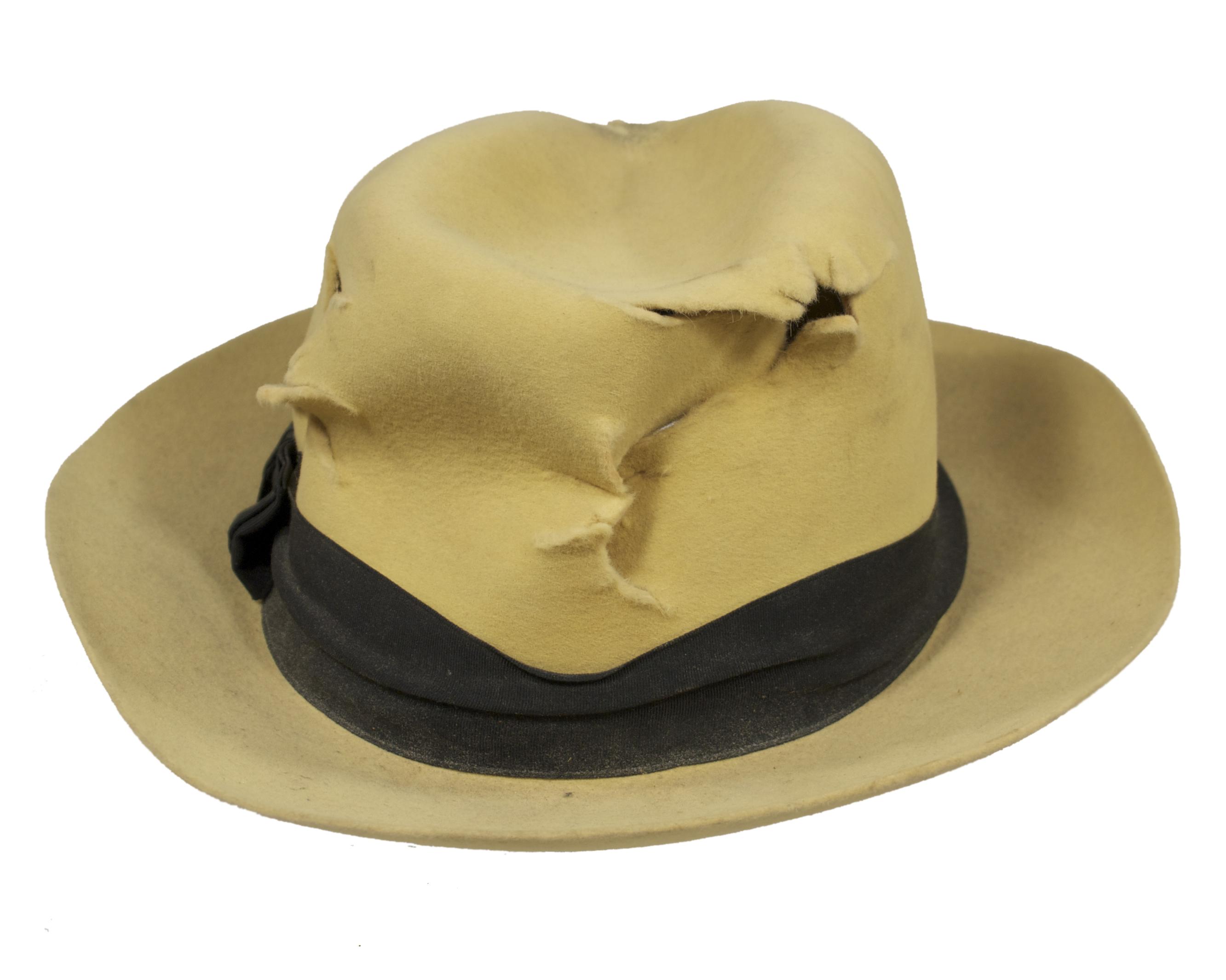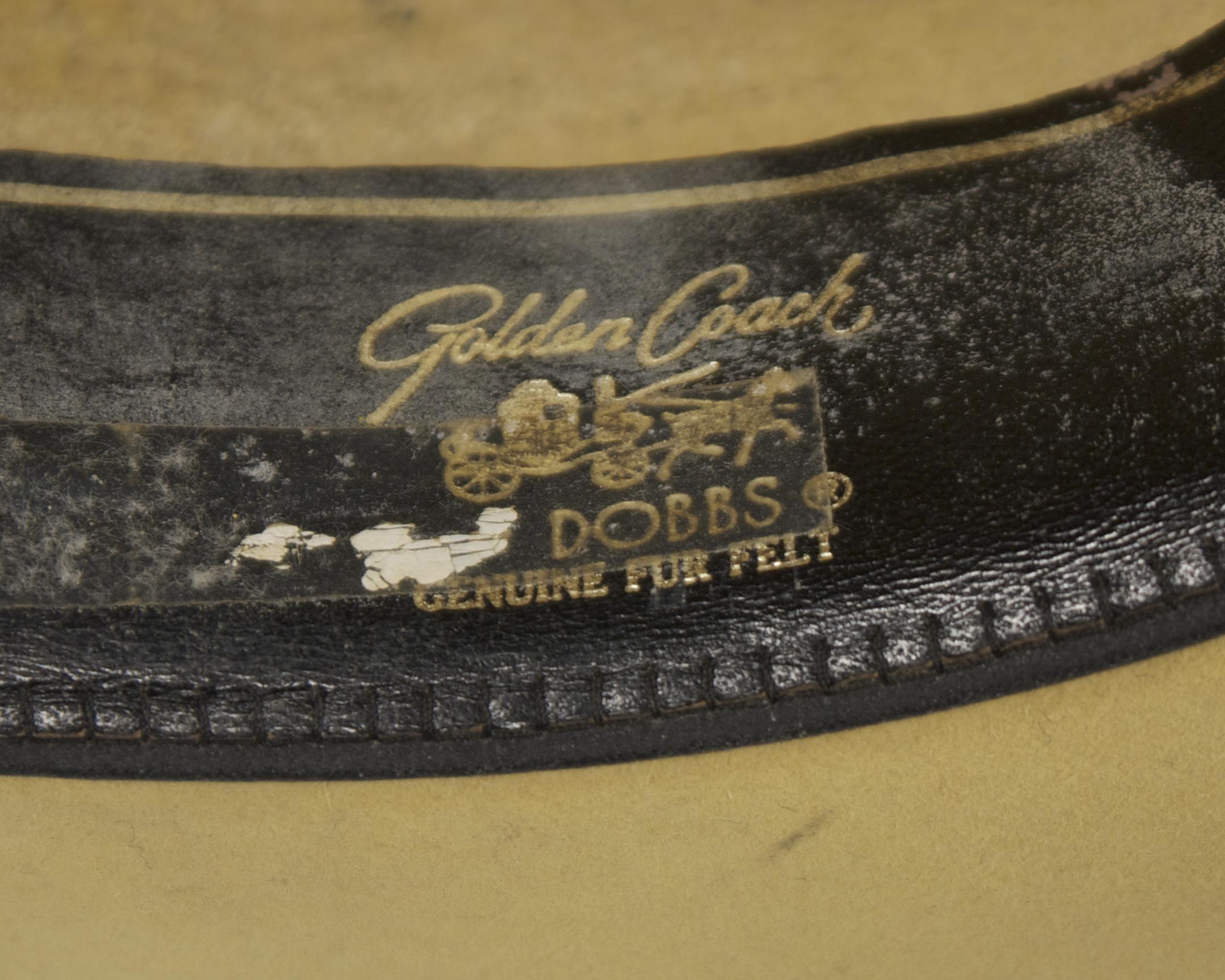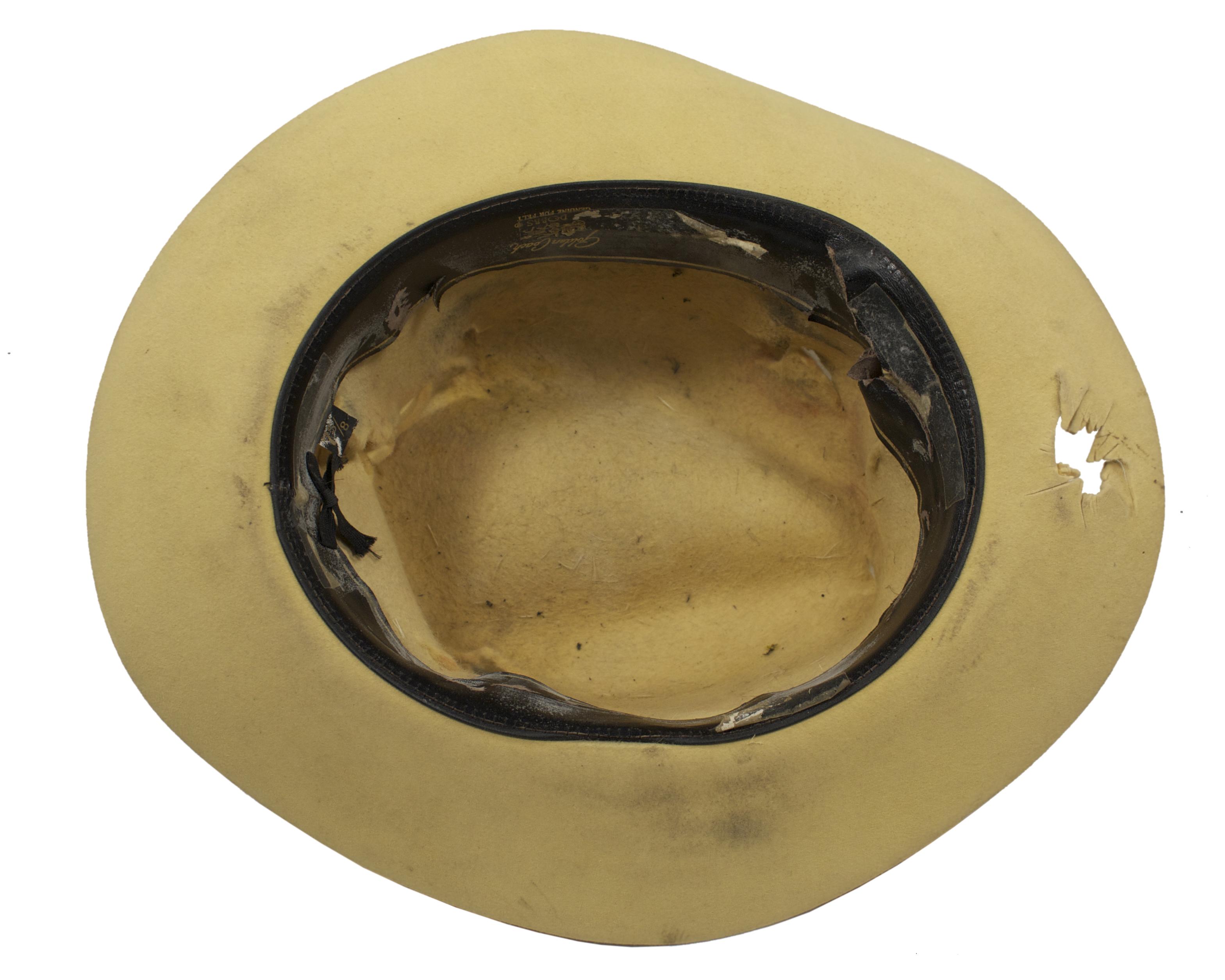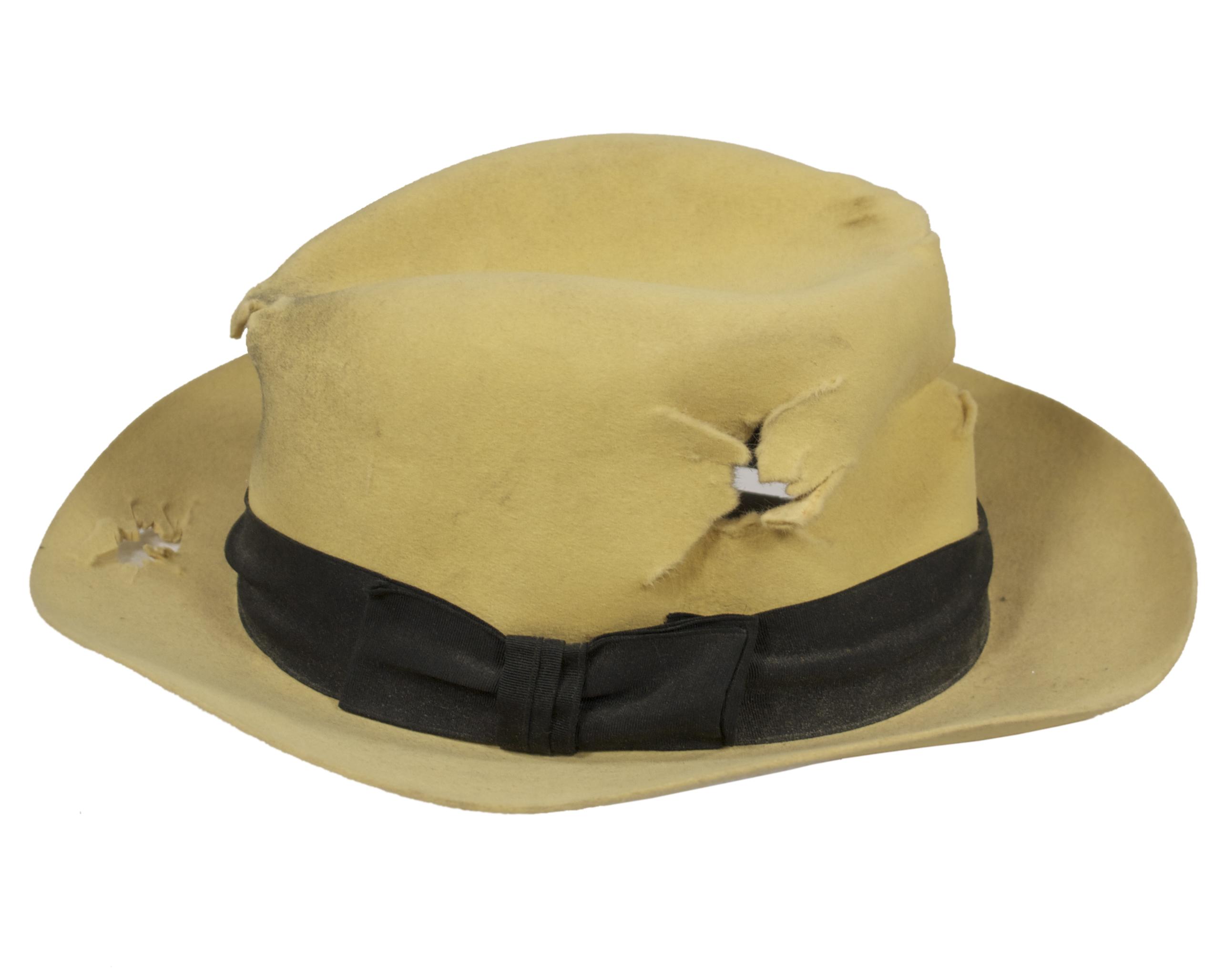 DICK TRACY (1990) - This bright yellow felt hat with black ribbon hat band was utilized by the character Dick Tracy portrayed by actor Warren Beatty in the 1990 motion picture “Dick Tracy” starring Al Pacino, Dustin Hoffman, and Madonna. The interior of the hat has maker’s label stamped inside reading “Golden Coach, Dobbs, Genuine Fur Felt”. The hat has been hand distressed with fake bullet holes for use in an action sequence and is the signature style “Dick Tracy” hat Mr. Beatty wore throughout the entire film.