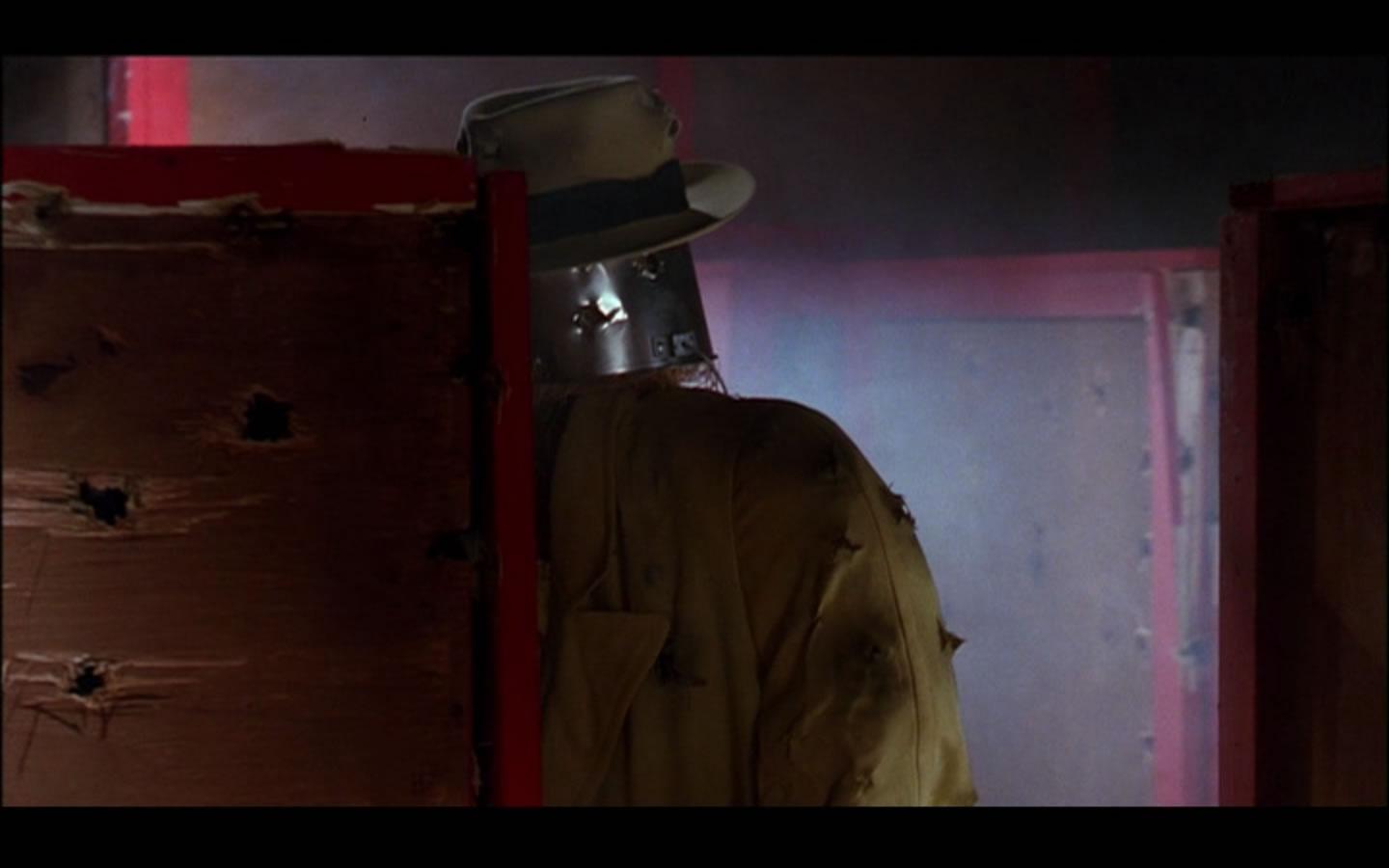 This hat was used in the sequence where Tracy arrives at the South Side Warehouse owned by Big Boy Caprice (Al Pacino) after getting a tip off to his radio watch from Bugs Bailey (Michael J. Pollard). When Tracy arrives at the warehouse he finds the two villains “Pruneface” (R.G. Armstrong) and “Influence” (Henry Silva) preparing to encase Bailey in a crate of concrete to drop in the river. Tracy tricks the two mobsters by propping his signature yellow hat and coat up behind a crate for the villains to shoot at while he sneaks around the side to save Bugs. After the two mobsters open fire they discover Tracy’s ruse and the coat and hat with screen-matched bullet holes are clearly seen. The hat is in hand distressed condition as seen in the film and is accompanied by a signed letter of authenticity from the Property Master who worked on the production.