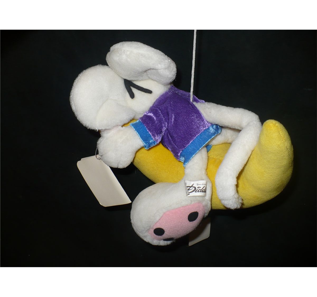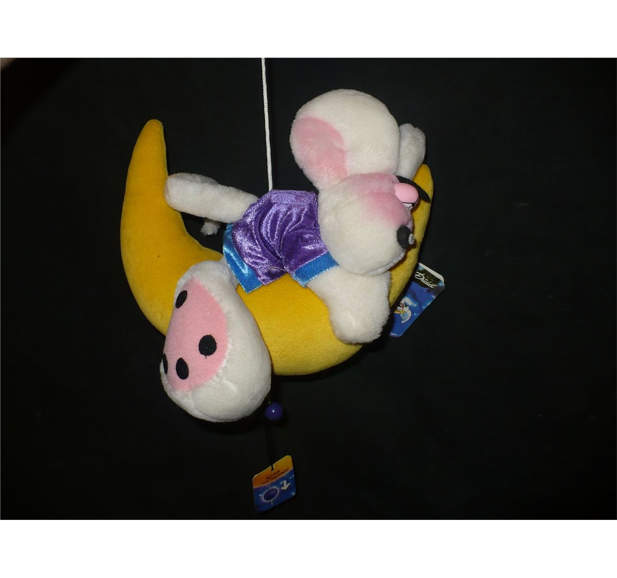 Offered here is the Diddl Mouse sleeping on the Moon Stuffed Animal like New with Tag by Thomas Goletz. It plays a melody when you pull the string at the bottom and it can be hung beside a kids bed to help them fall asleep. Absolutely adorable! It makes a great Christmas Gift!