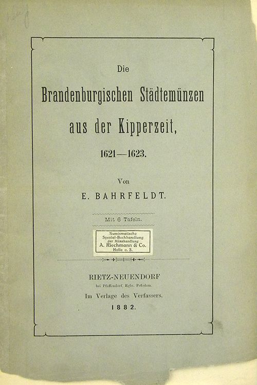 Bahrfeldt, E. DIE BRANDENBURGISCHEN STÄDTEMÜNZEN AUS DER KIPPERZEIT, 1621-1623. Rietz-Neuendorf, 1882. 8vo, original printed wraps. vii, (1), 78 pages; 6 lithographic plates of coins. Front wrap chipped and reattached with archival tape. Near fine. Quite scarce.