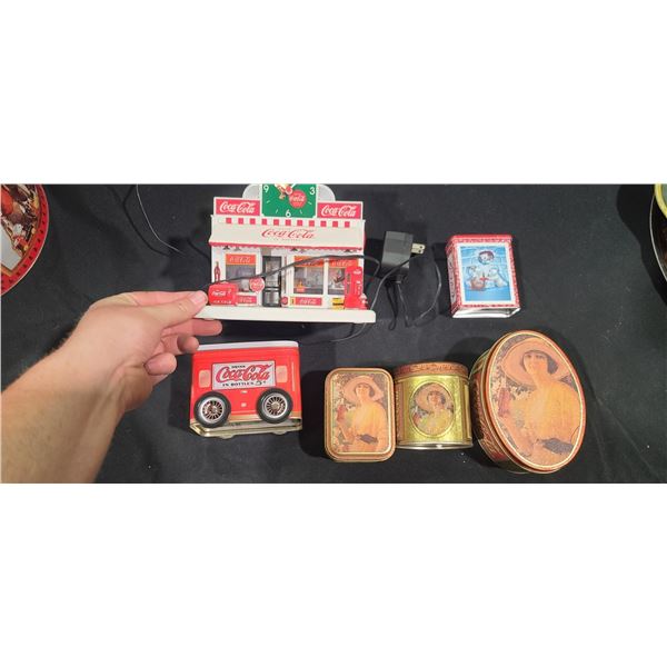 THE COCA COLA SODA FOUNTAIN CLOCK AND FIVE TINS