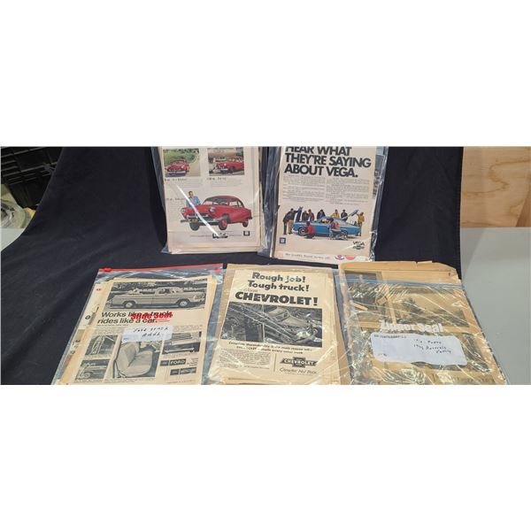 LARGE LOT OF 100 +/- NEWS PAPER ADDS FROM 1930'S TO 1970 - CARS; FORD, TOYOTA, CHRYSTLER, JOHN DEERE