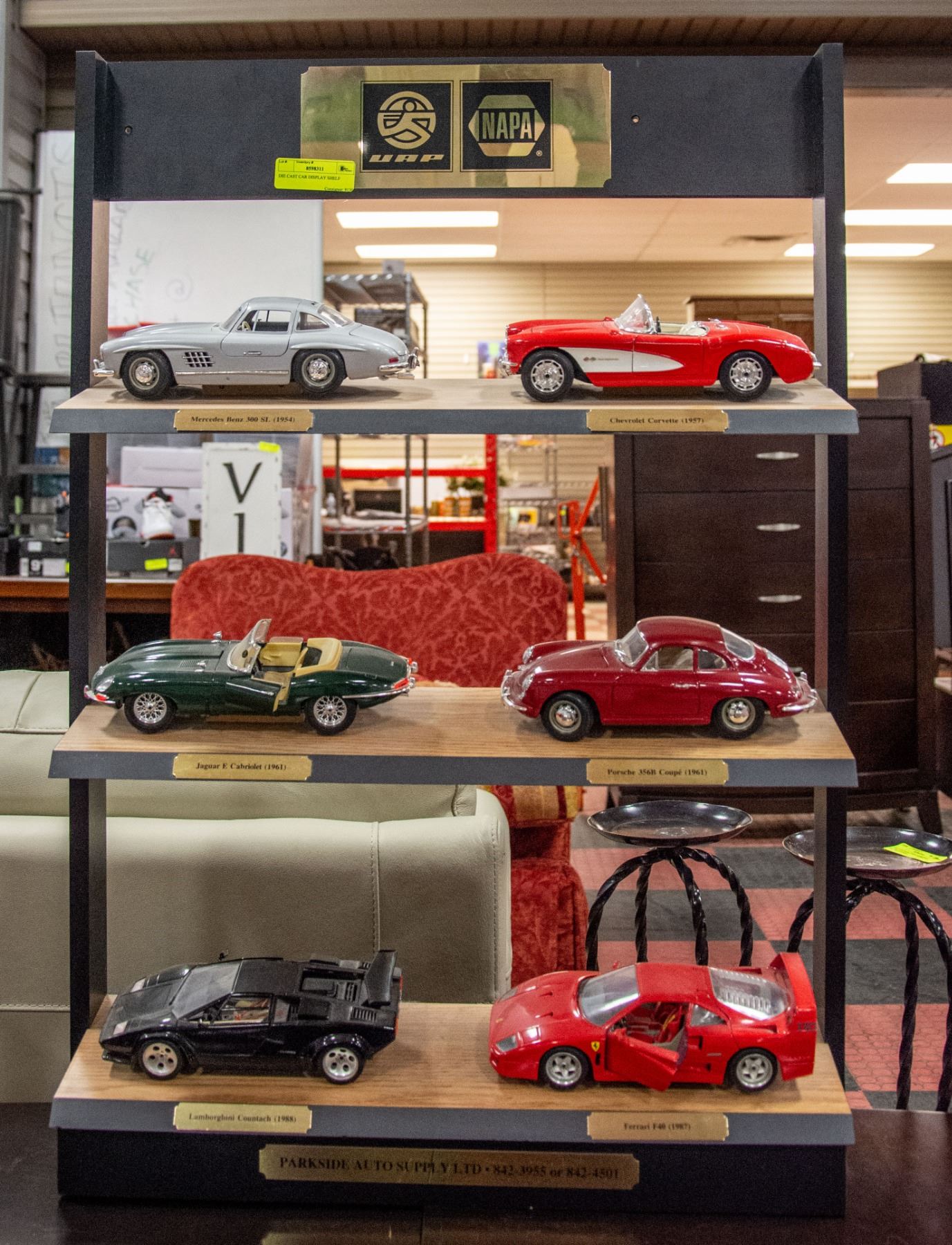 24"W X 35"H C/W (6) DIE CAST COLLECTABLE CARS EACH CAR IS 10" LONG