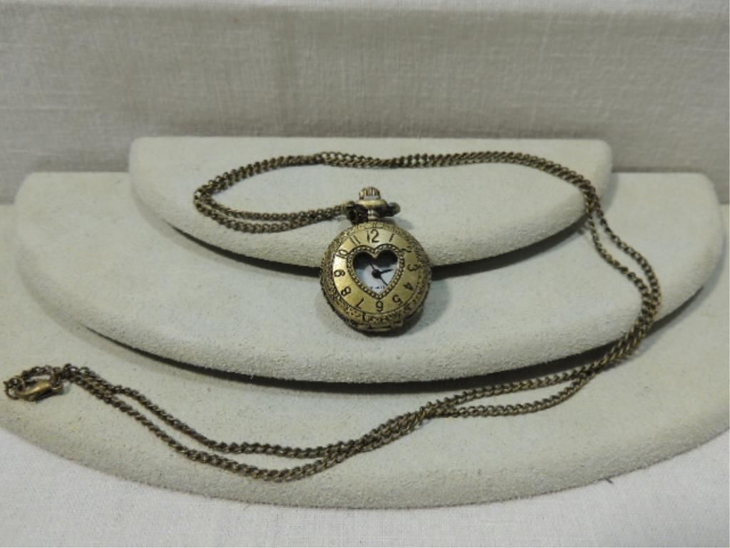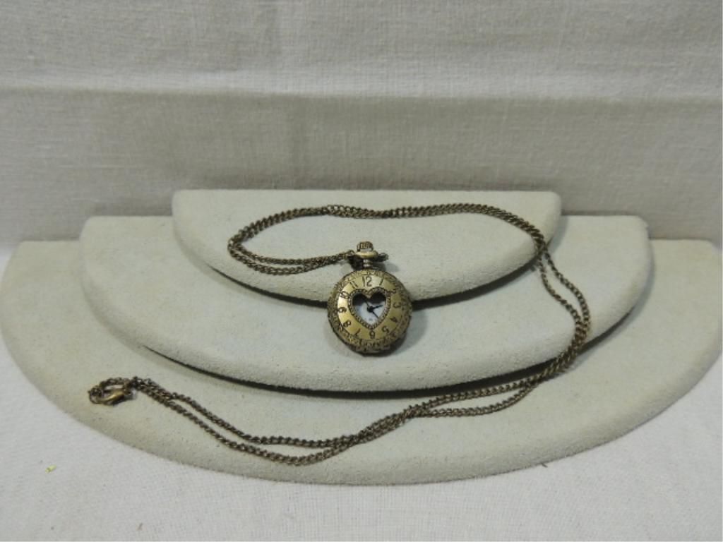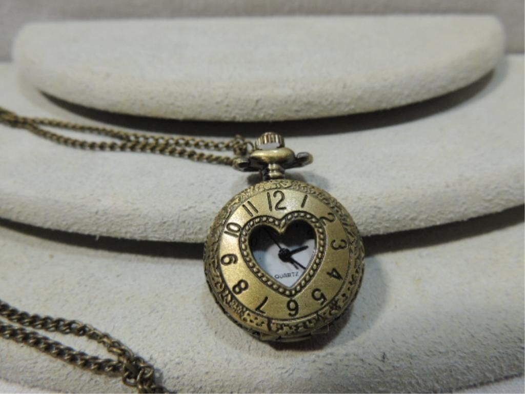CONTEMPORARY DIE CAST QUARTZ POCKET WATCH. LOCKET WATCH. LONG CHAIN AS SHOWN. VIEW PICTURE FOR DETAIL.